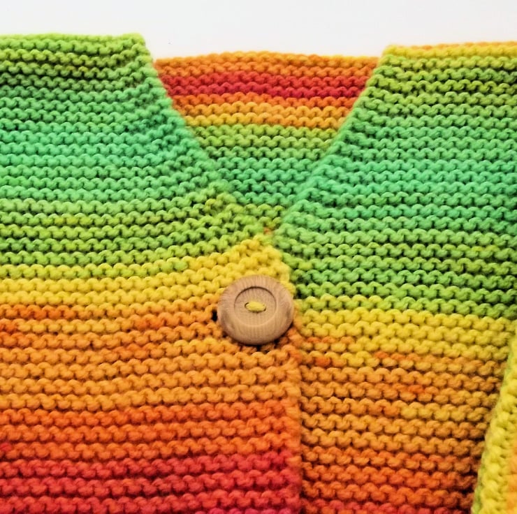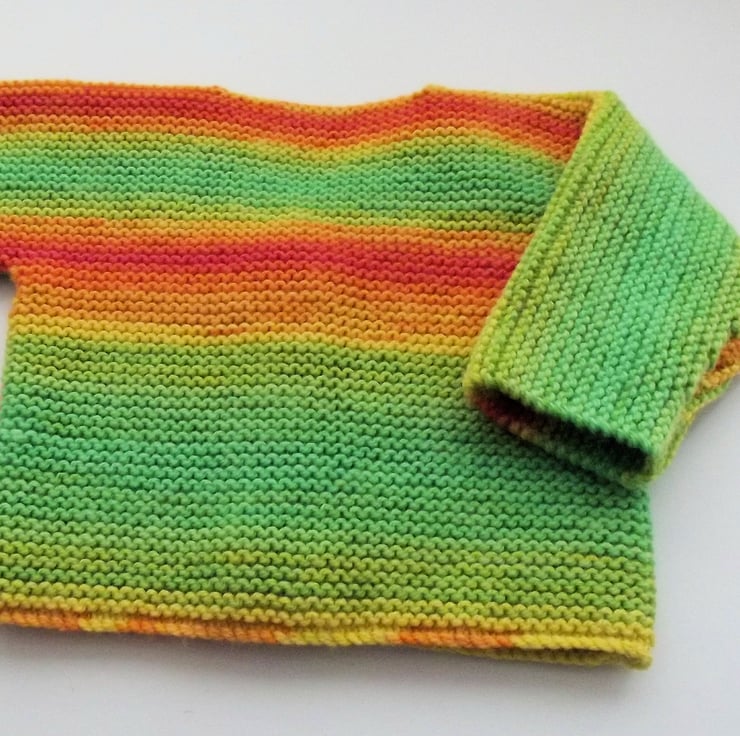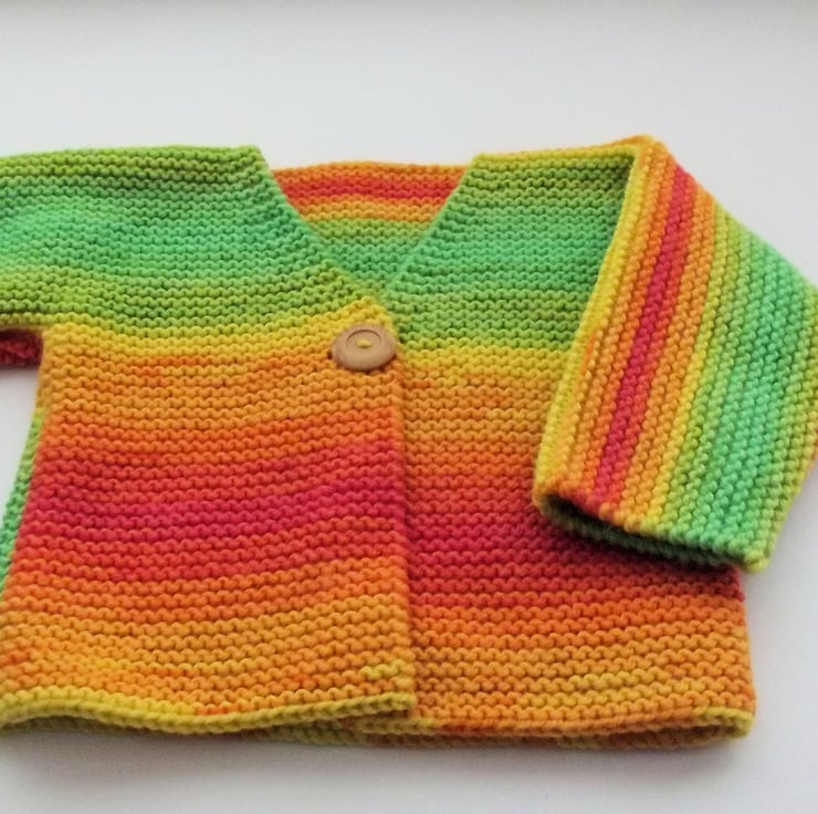 Hand knitted by me. Bright Multi coloured Cardigan Jacket. V neck with 1 wooden look button closure. Knitted in medium weight acrylic blend yarn. hm58