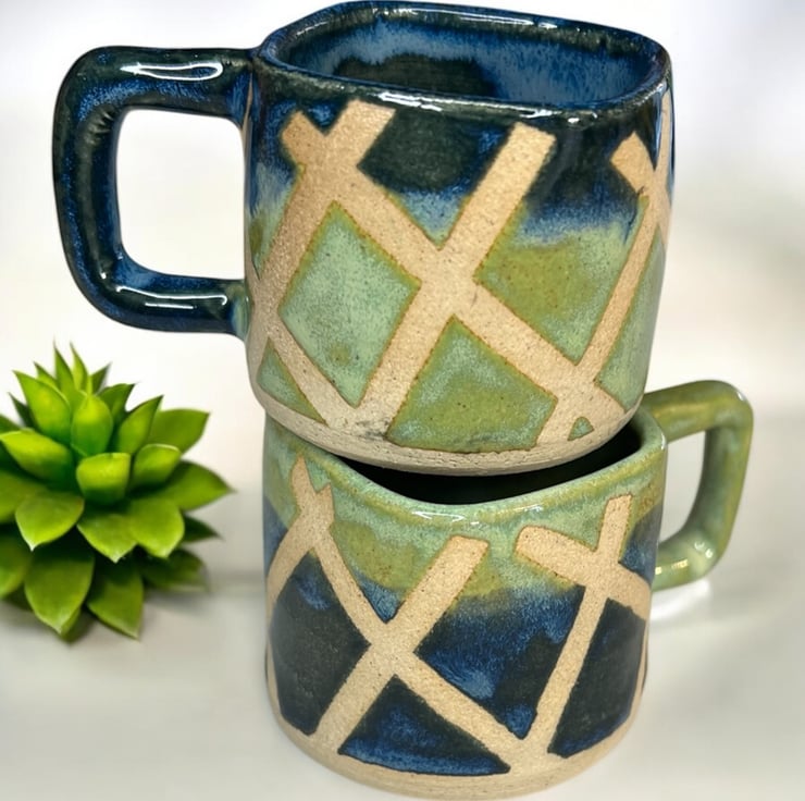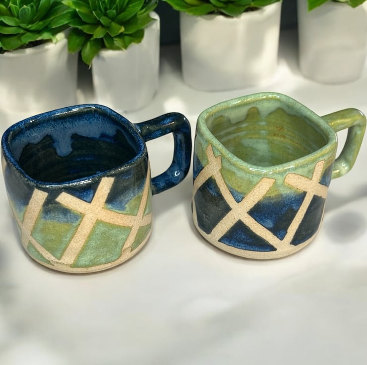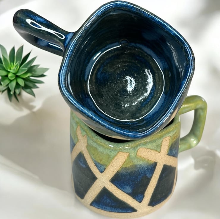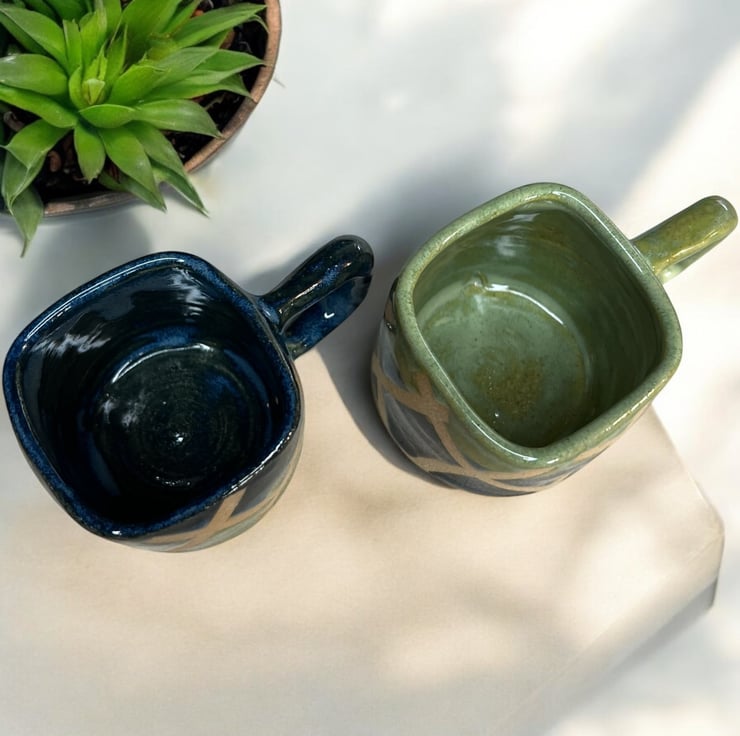 Individually wheel-thrown in my garden studio, these unique espresso cups feature a distinctive square opening and handle. Glazed in stunning Louisiana Bayou and Morning Glory, they bring artisanal charm to every caffeine hit. Perfect for coffee lovers who appreciate style and craftsmanship.