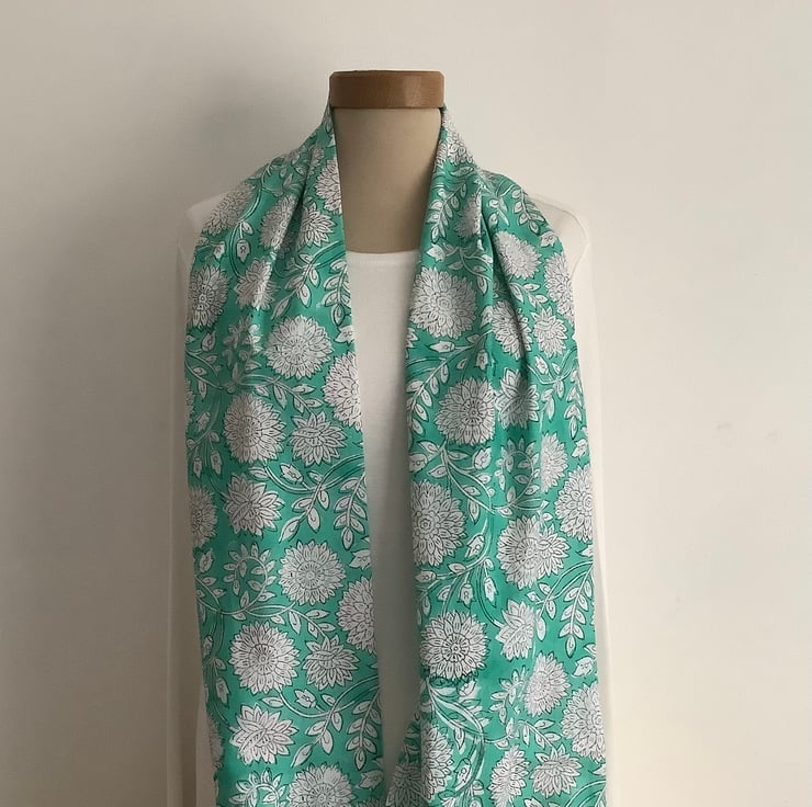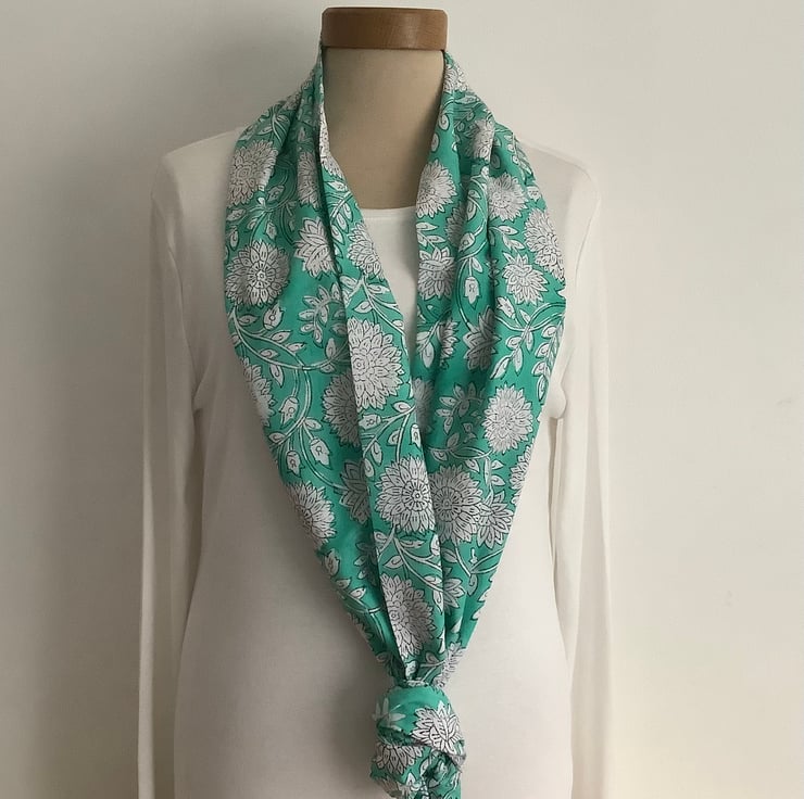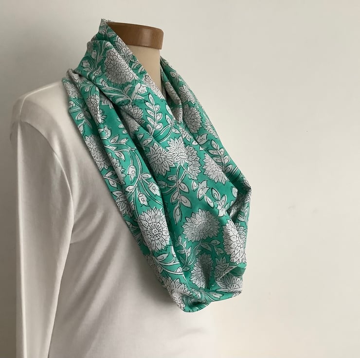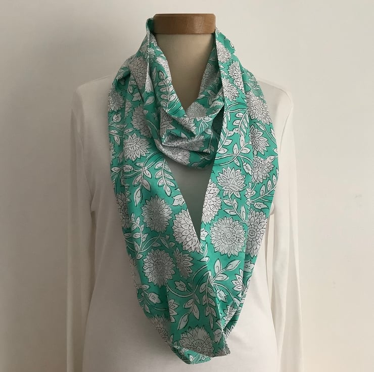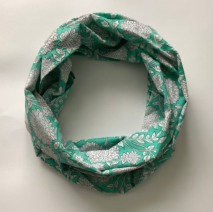 I have designed and made this lovely , lightweight infinity / tube -like scarf / skinny scarf with those in-betweeny months in mind ! I've used a deliciously soft and cool , Indian block-printed 100% cotton fabric, with enough drape to adjust / loop twice .This accessory will take you through pretty much every season ! .