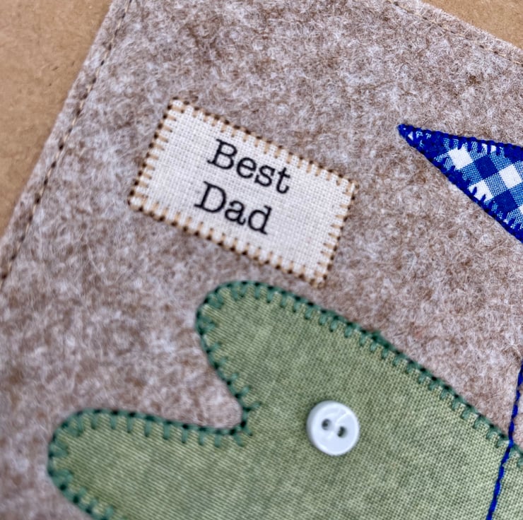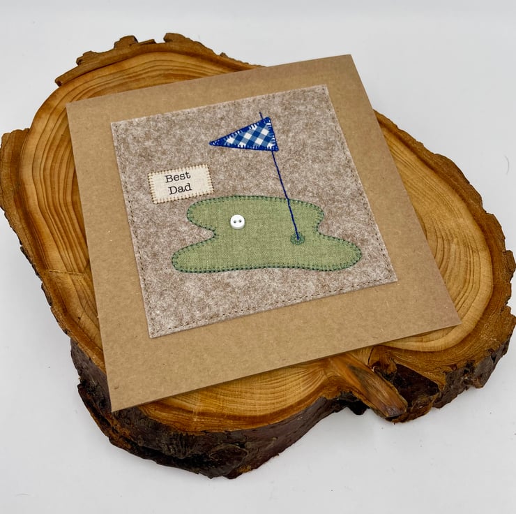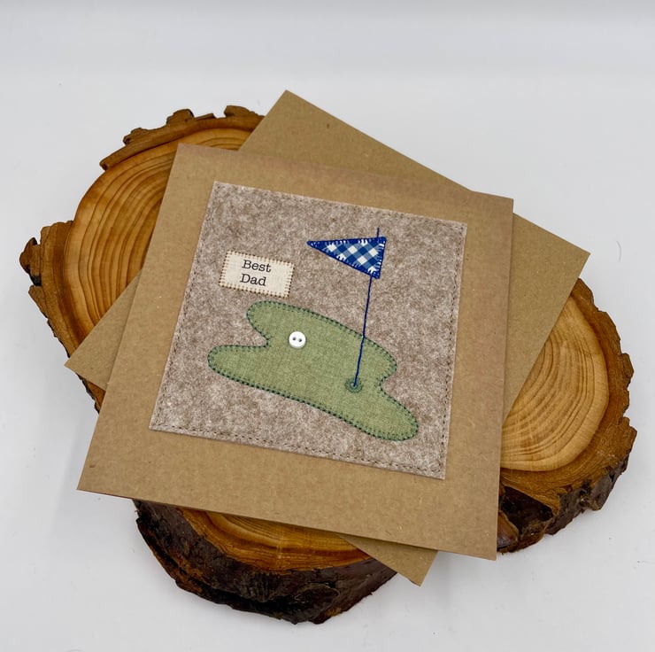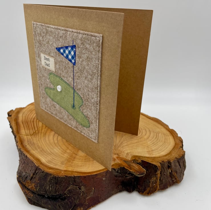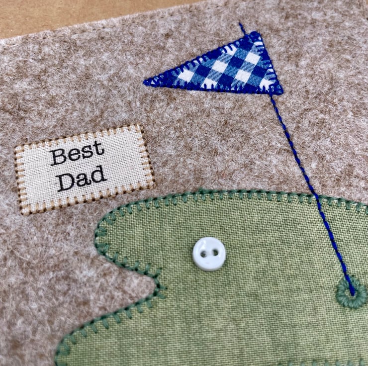A hole-in-one card for the Best Dad! This charming appliqué design features a golf flag, a lush green, and a little button golf ball—stitched together with care on woollen felt and a recycled card. Perfect for a birthday, Father’s Day, or just to say thank you to a dad who’s truly above par!
