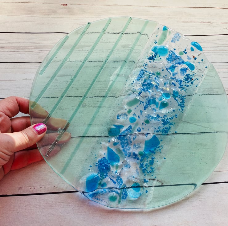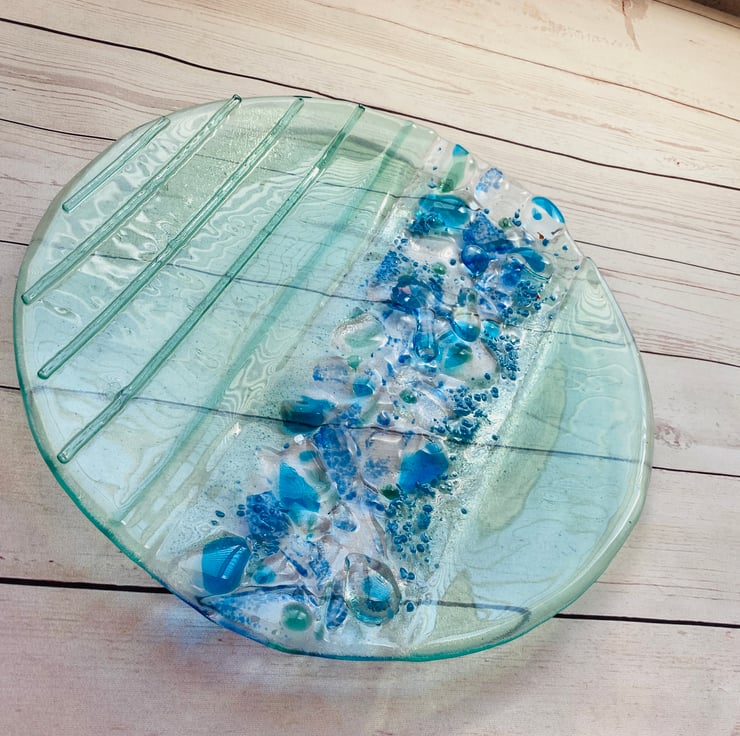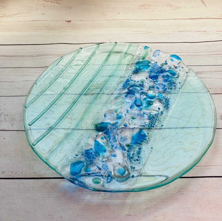 Textured decorative fused glass platter - approximately 10 inch diameter and 6mm thickness - designed to be a statement piece in the home . Created over 3 separate kiln firings to create the beautiful water inspired piece . Perfect hand crafted glass for your home or to gift