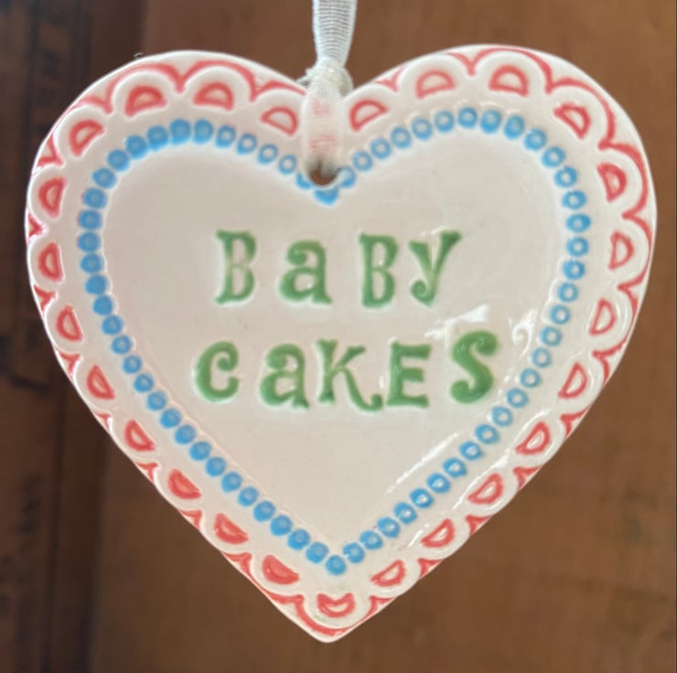 This little heart is made from white earthenware clay, imprinted with the words Baby Cakes. The perfect gift to let someone know how much you love them! Some of the letters may be a bit higgledy piggledy but they have been stamped with love! It has been fired twice, once to the bisque stage and then a second firing for the clear glaze. It measures 4.5 centimetres wide x 5cm height x 5mm thick. It can be hung outside.