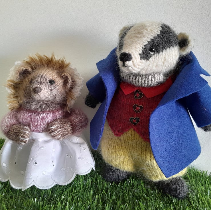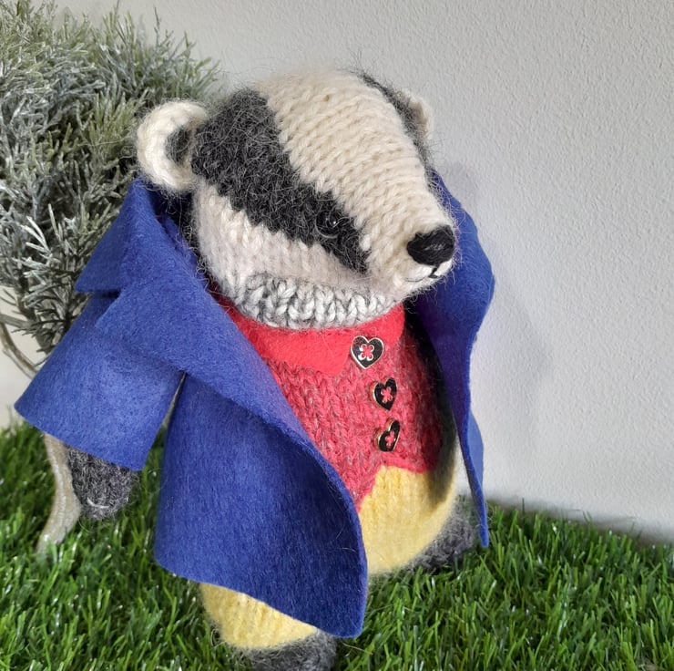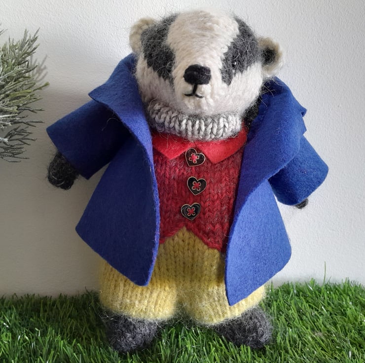 Tommy Brock is one of the characters from the Beatrix Potter Peter Rabbit book. He measures 9" (22cm) and is knitted in alpaca and mohair yarns to create his black and white body and his colourful clothes. His blue jacket is made of felt and is hand stitched.