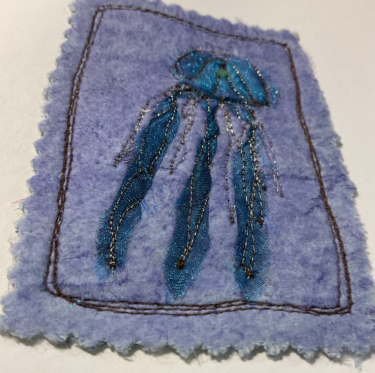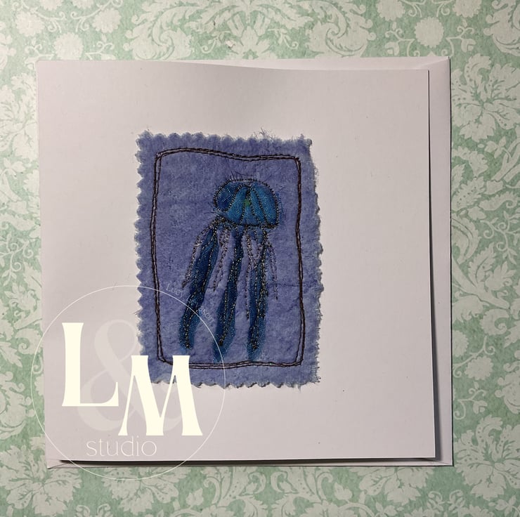 A blank greetings card featuring a fabric blue jellyfish picture.