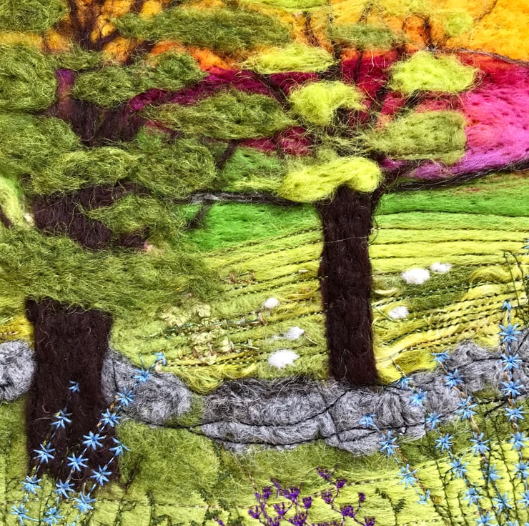 Felted with wool onto linen, details of flowers in the foreground, created by machine embroidery.