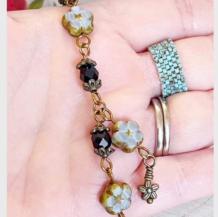This delicate floral bracelet is handmade with two types of Czech glass beads. The petite flowers feature a blue-grey hue with a Picasso-like finish on the edges. The fire-polished round beads are a deep jet black and are paired with bronze filigree bead caps.
