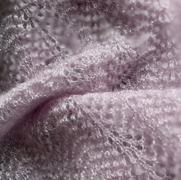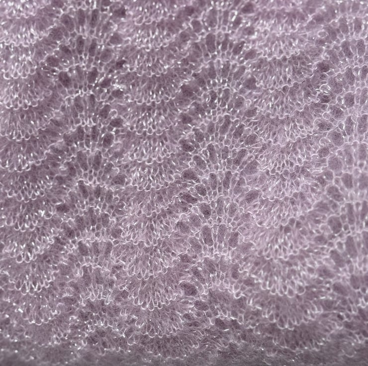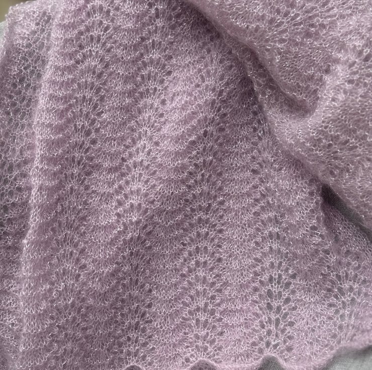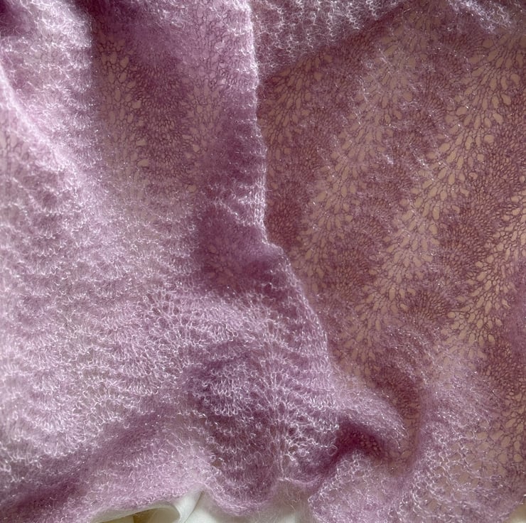 This beautiful pale lilac scarf is hand knitted using the feather and fan stitch which is a classic Shetland design know for its wavy, lace like appearance. The scarf is made from Drops KidSilk yarn, a luxurious blend of 75% kid mohair and 25% silk giving it a light finish that adds to its sophisticated look. The addition of a silver thread running through further enhances its lustre, making it even more elegant.