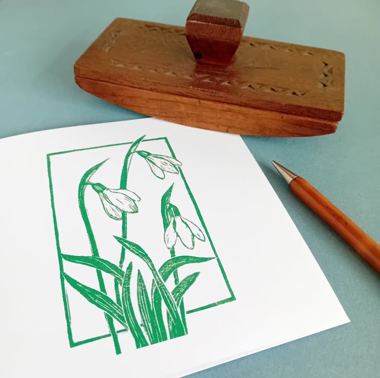 A professionally printed greetings card from an original snowdrop lino cut. Perfect to celebrate a birthday, Mother's Day or just to say hello.