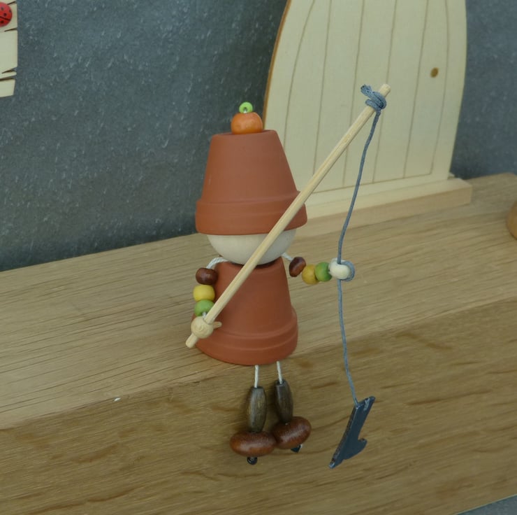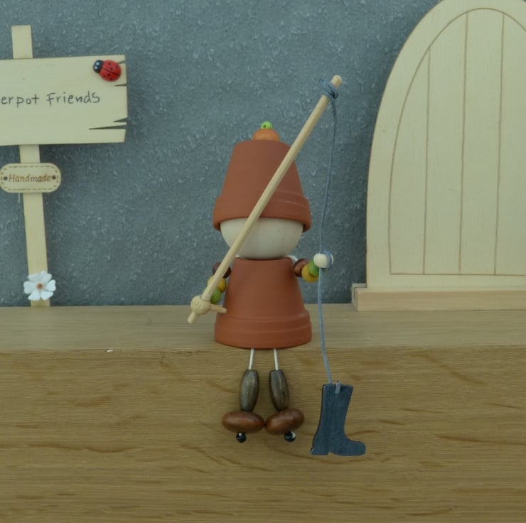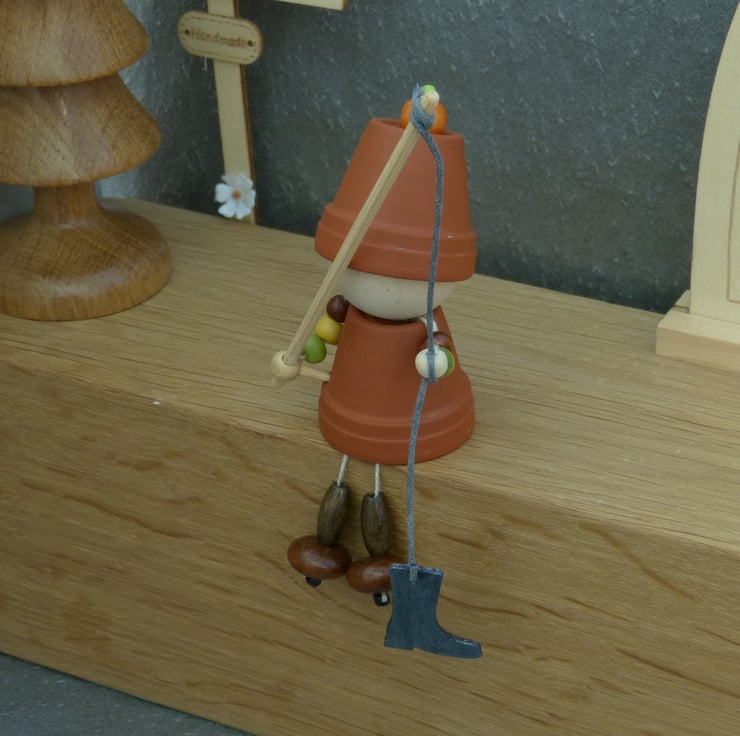 A terracotta Flowerpot friend with a handmade wooden fishing rod and a black painted wooden wellington boot.