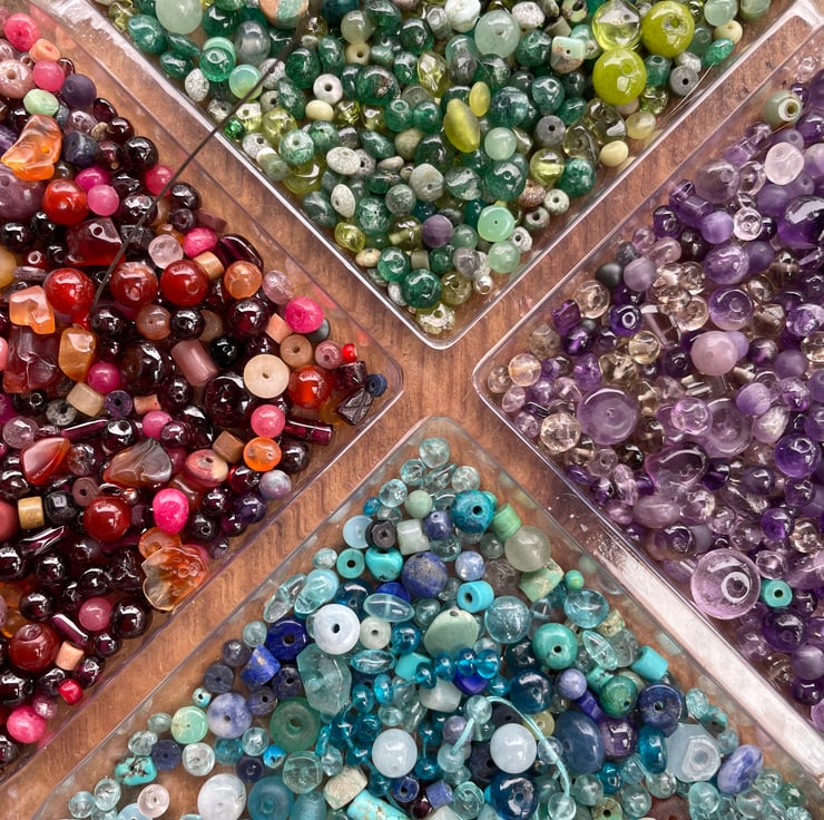 Garnet, carnelian, amethyst and smoky quartz are the predominant gemstones, but there are others too. Ruby, jasper, aventurine and agate have also slipped in. The beads are in a mix of profiles and finishes, the majority are around 4mm diameter.