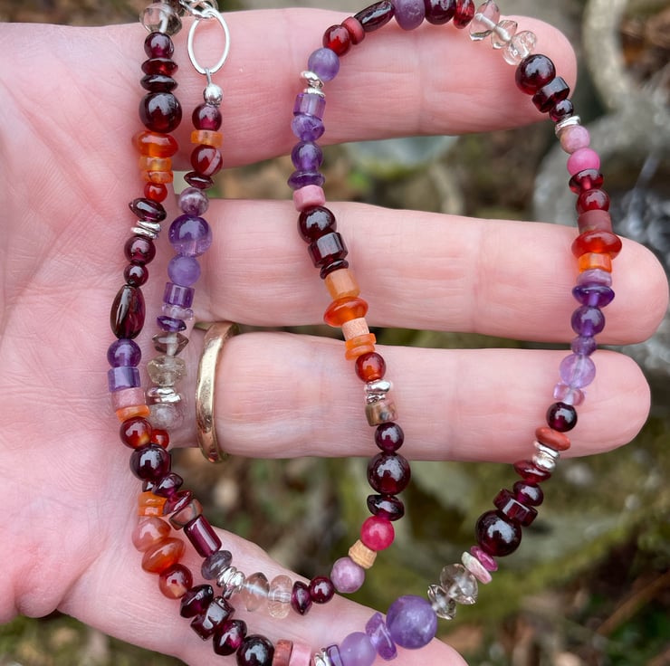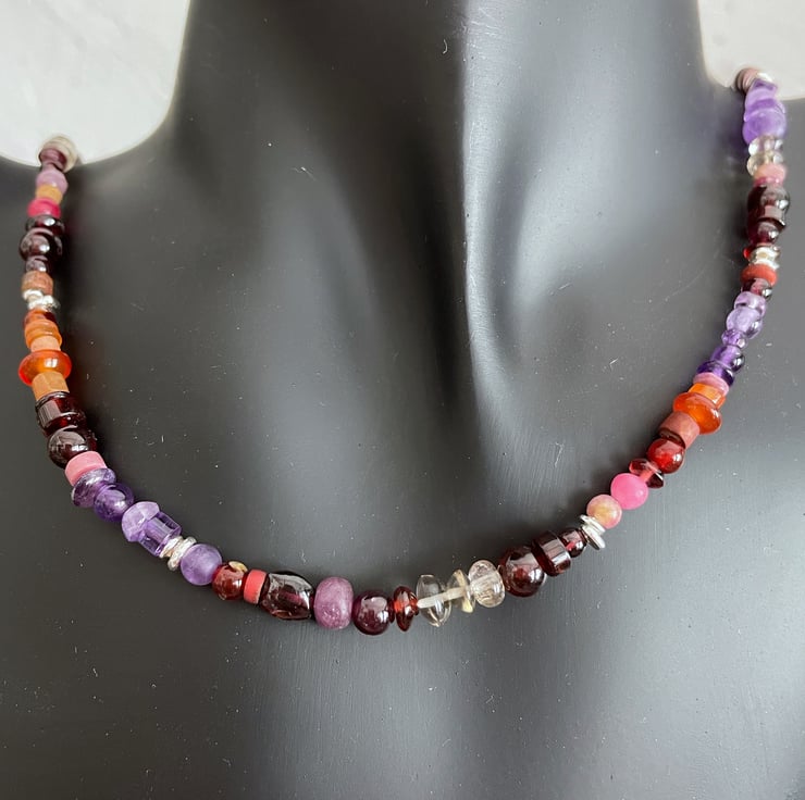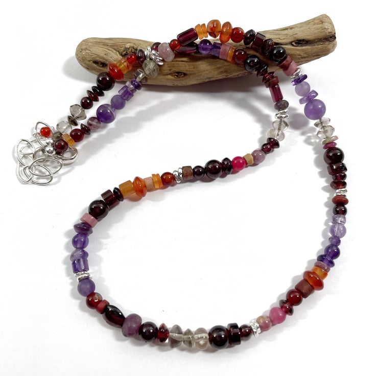 I have gathered stones in reds, oranges, purples and greys to make this necklace.