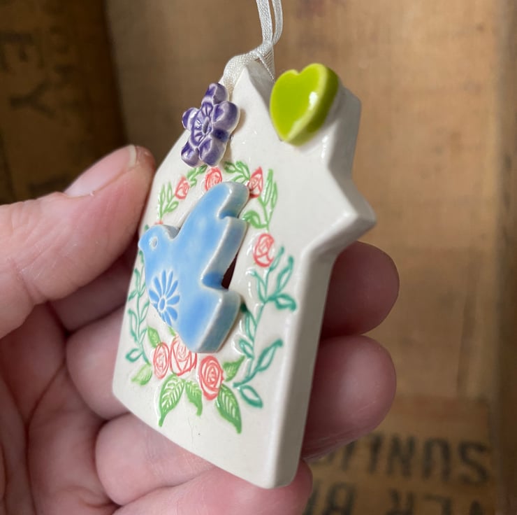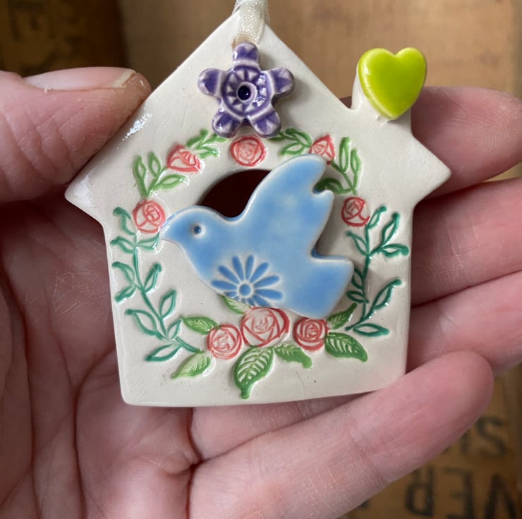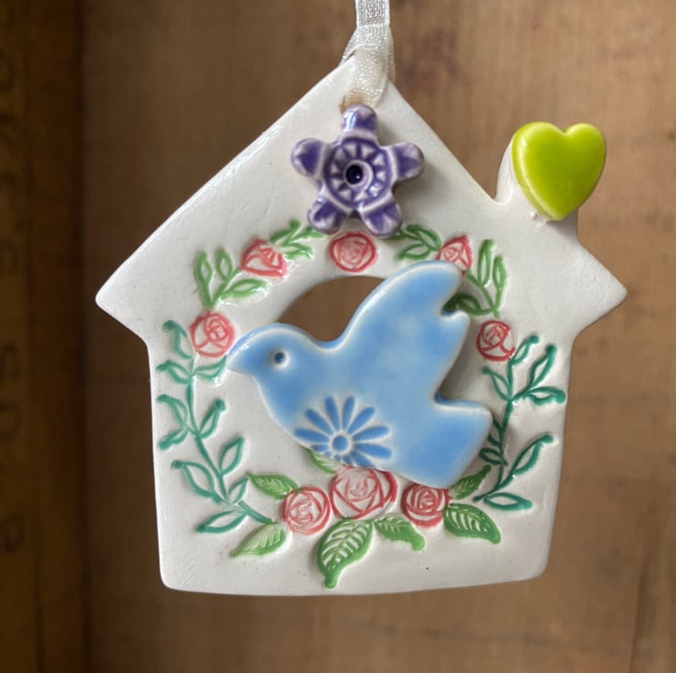 This little bird house decoration is made from white earthenware clay and finshed with a little pottery bird. It has been fired twice and finished with a glossy glaze for a lovely smooth finish. It measures 5 x 6cm and hangs from a cream organza ribbon.