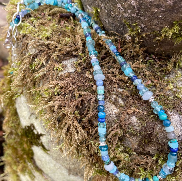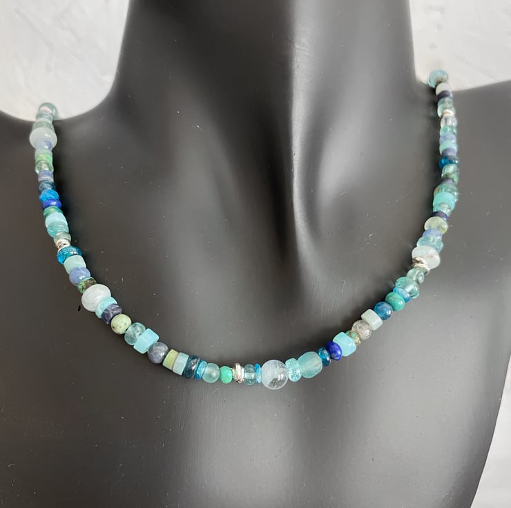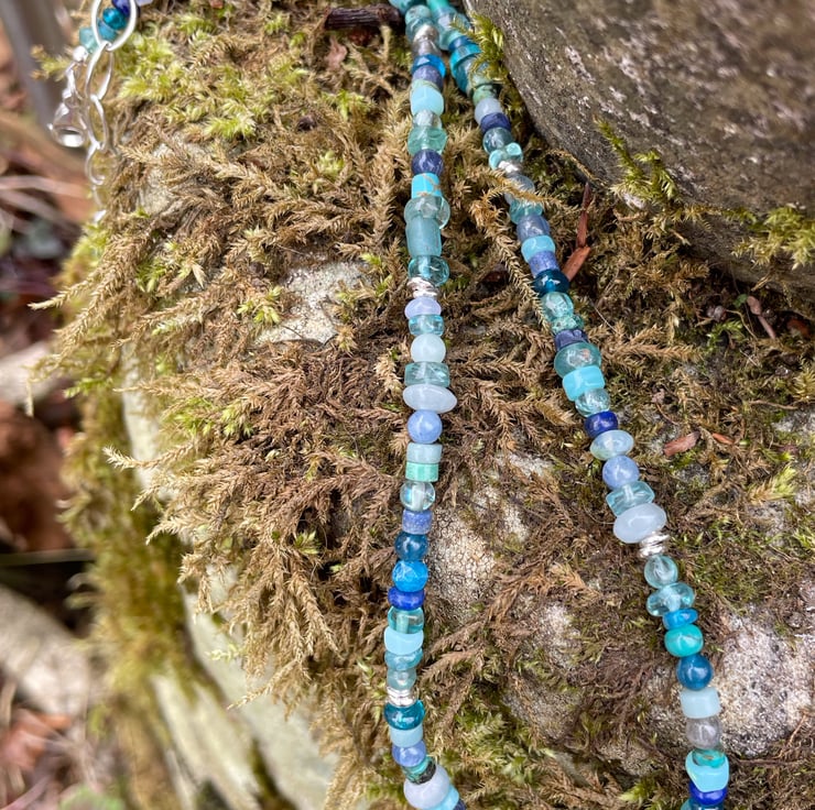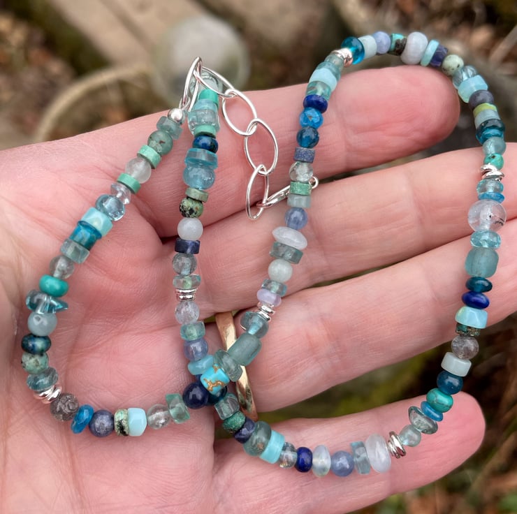 Gemstone and sterling silver bead necklace in blues.