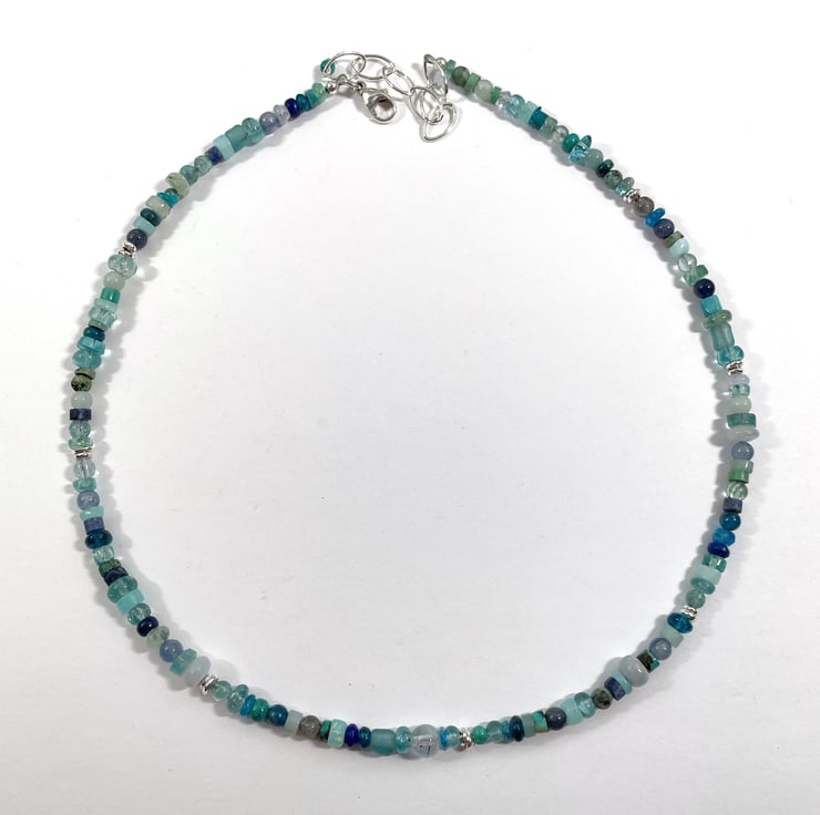 A colourful gemstone and silver small bead necklace with silver clasp. Adjustable length.