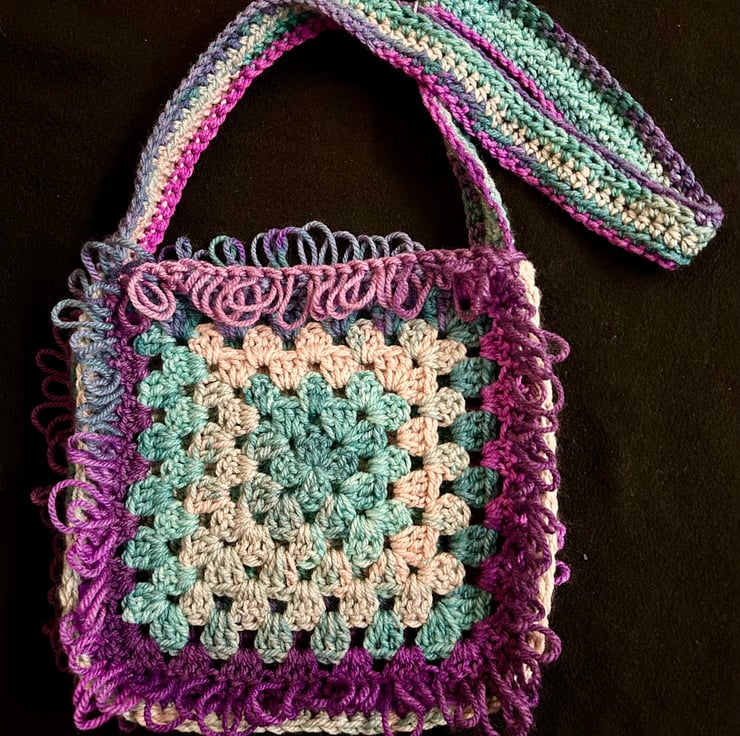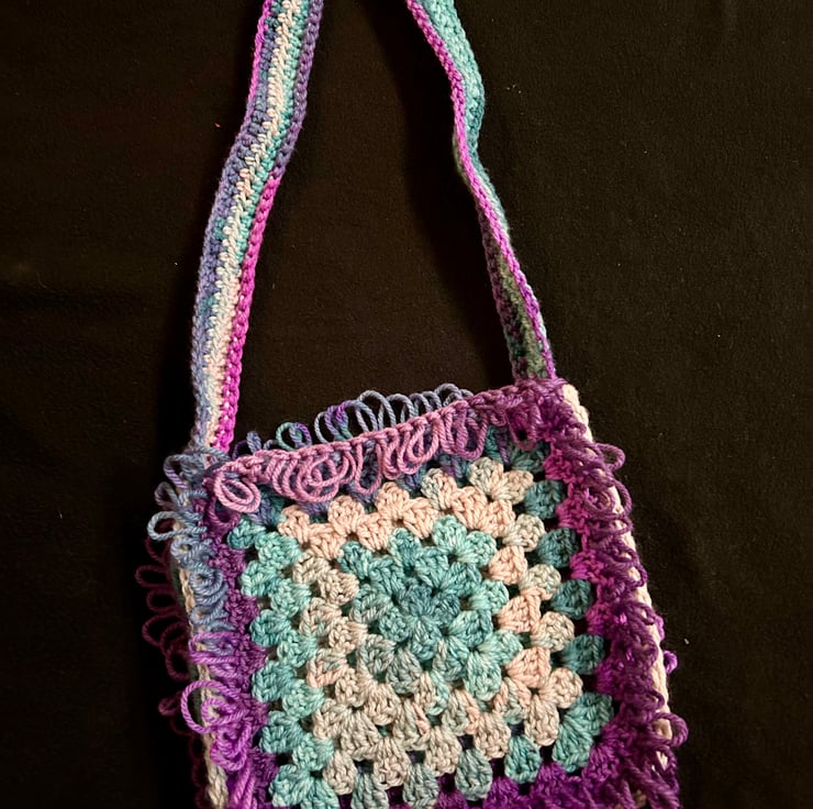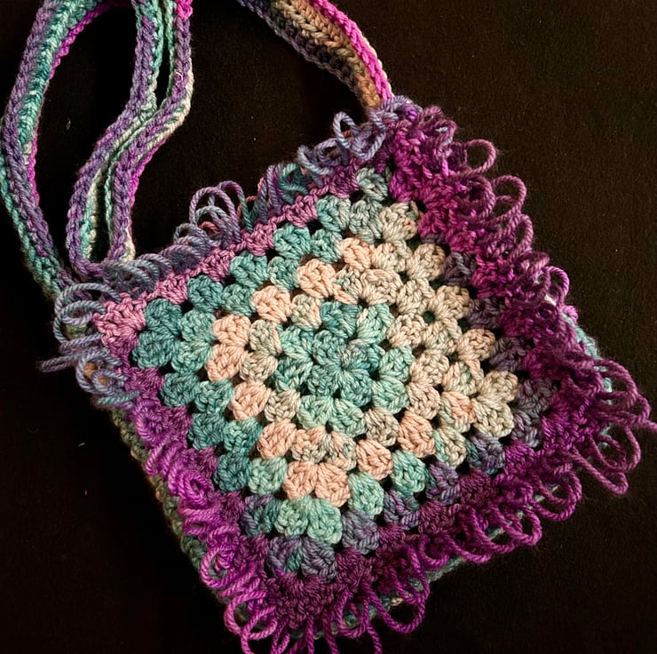 A hand crocheted bag created from two large granny squares surrounded by a loopy border. Bag has a shoulder strap and is not lined. Made from Yarnsmiths Play chunky acrylic yarn the lightweight bag would be a nice bright accessory. Bag measures 25cm x 25cm x 6cm.