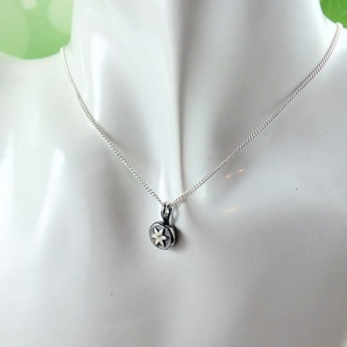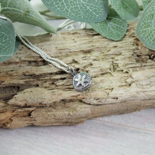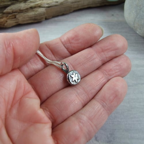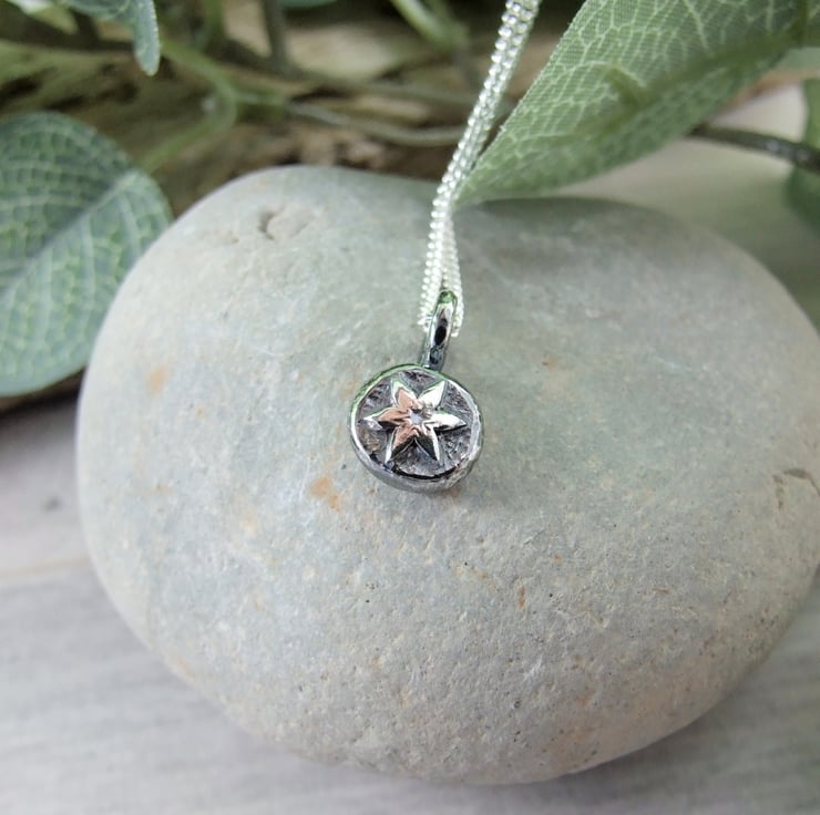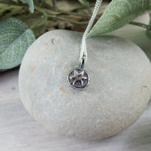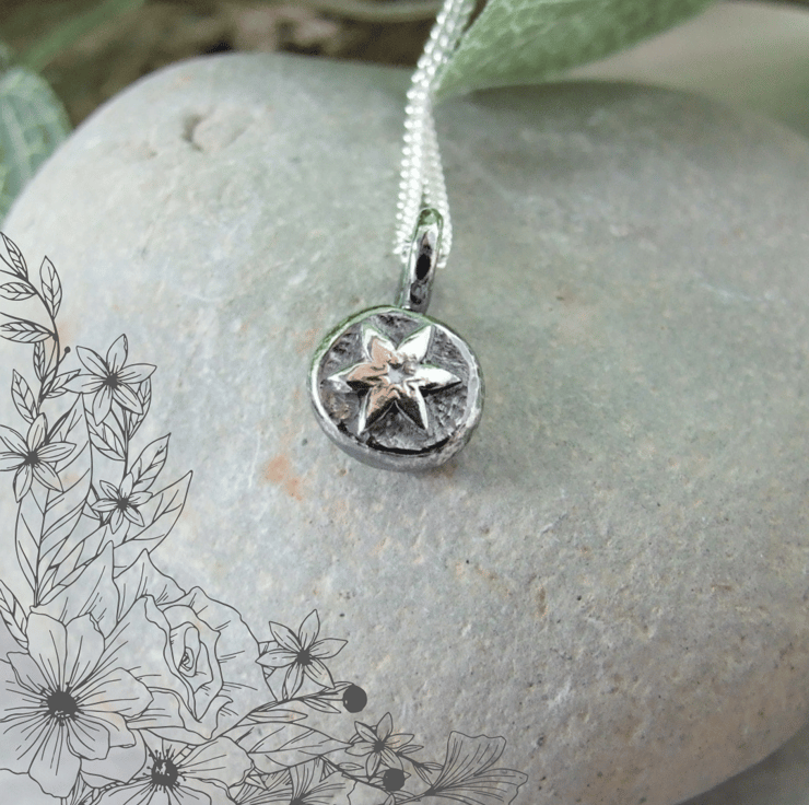 I have created the small silver nugget from recycled silver heated to melting point when it forms a natural pebble shape, then once cooled slightly flattened on the top and added the loop to hang. I then soldered on a tiny star flower. I created the texture on the flower with hand tools to give detail. Fitted to an 18 inch sterling silver chain.