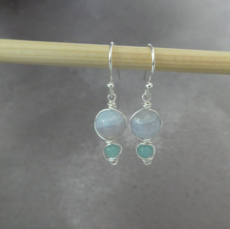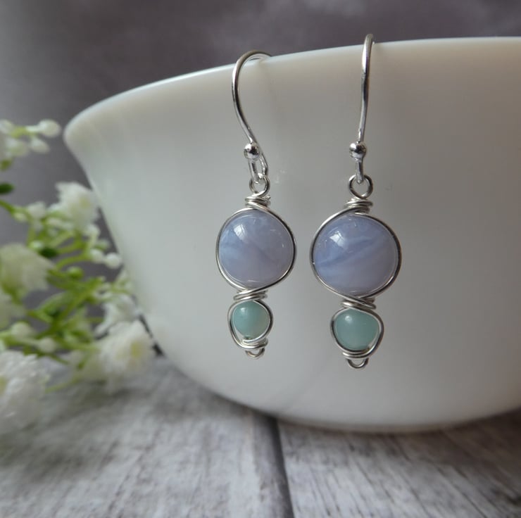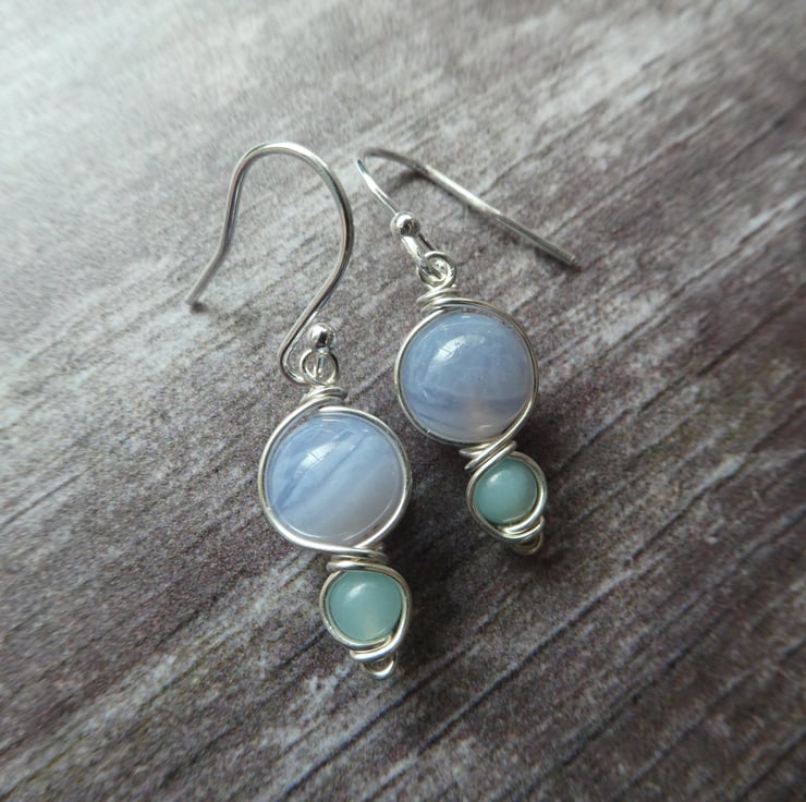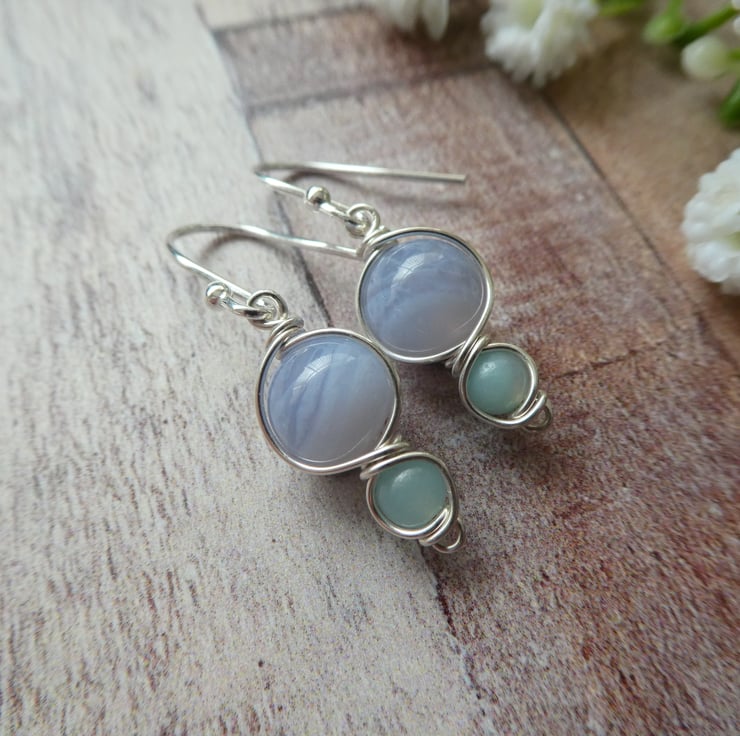 These pretty earrings feature 8 mm blue lace agate beads and 4 mm amazonite beads, wrapped in a twist of sterling silver wire which forms a framework around the stones. They are finished with a simple pair of sterling silver ear wires. This style measures approximately 32 mm to the top of the ear wires by 9 mm wide.