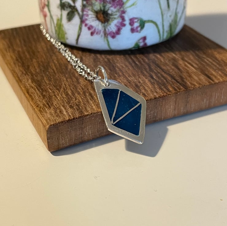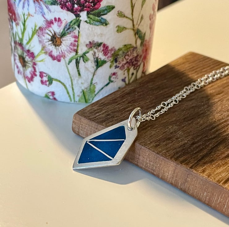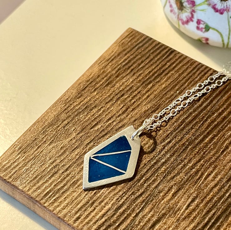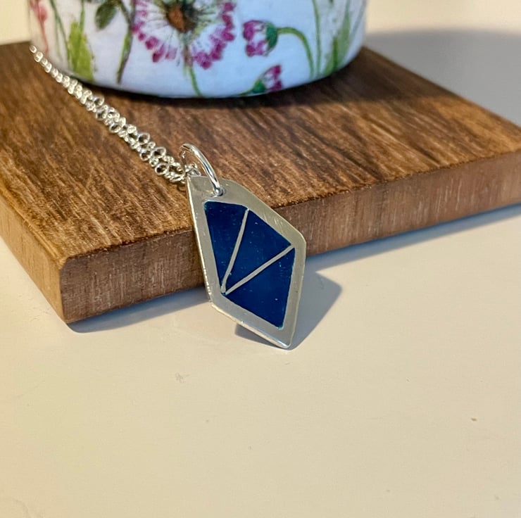 My love of enamel continues. This fine silver pendant uses the sharp edges of the pendant's shape to infill with blue enamels. The pendant hangs from an 18inch sterling silver chain.