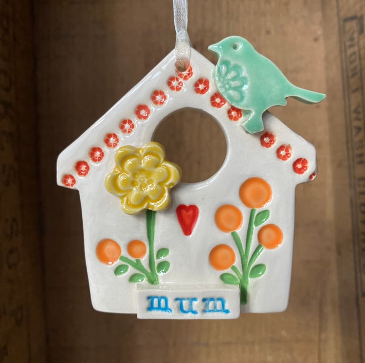 This ceramic bird house decoration is made from white earthenware clay and finshed with a little pottery bird. It has been fired twice and finished with a glossy glaze for a lovely smooth finish. It measures 6.5cm x 7cm and hangs from a cream organza ribbon.