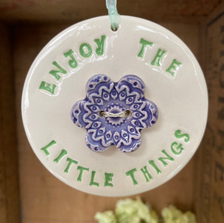 This ceramic decoration is made from white earthenware clay and finshed with a little pottery flower with wire detailing. It has been fired twice and finished with a glossy glaze for a lovely smooth finish. It measures 6.5cm diameter x 1cm deep and hangs from a green organza ribbon.