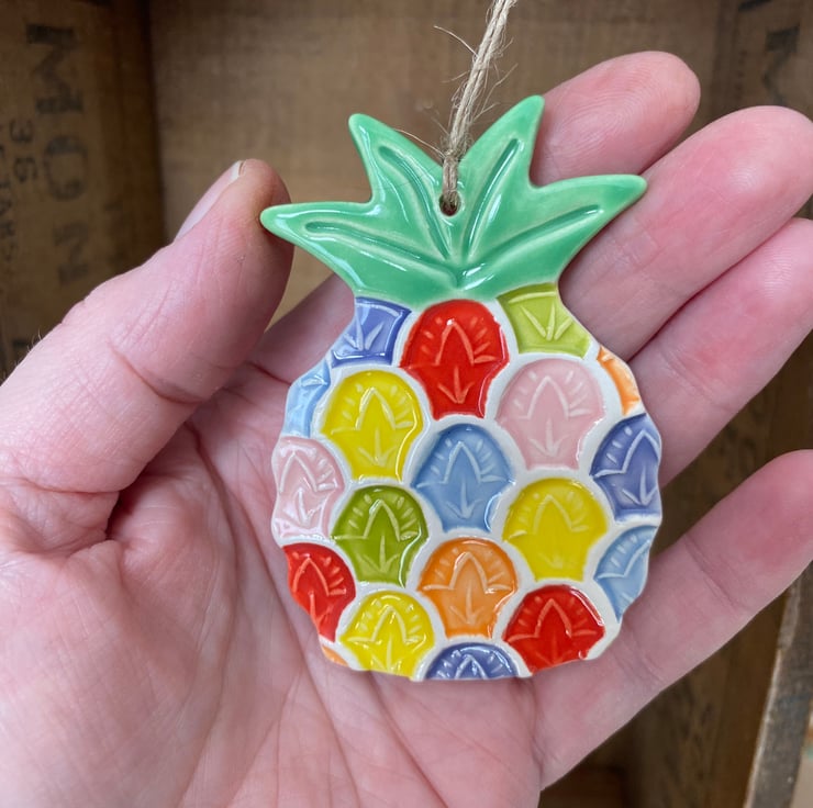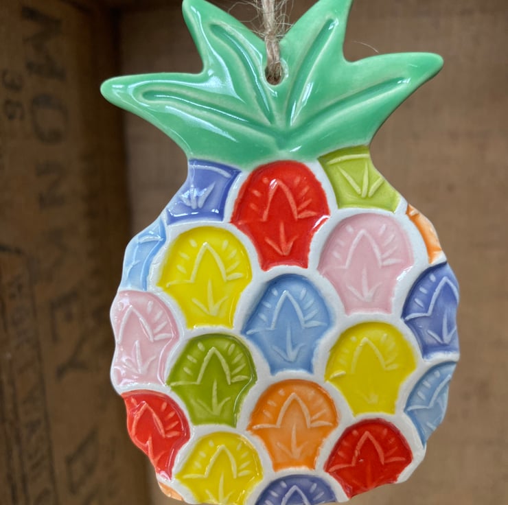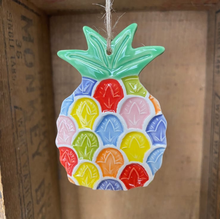 This little pineapple has been cut from white earthenware clay, decorated with a teeny little stamped design that I made myself and then fired. It has then been glazed with a variety of bright glossy glazes and fired again to 1100 degrees. It hangs from a brown string. 7.5cm high x 5.5 cm wide