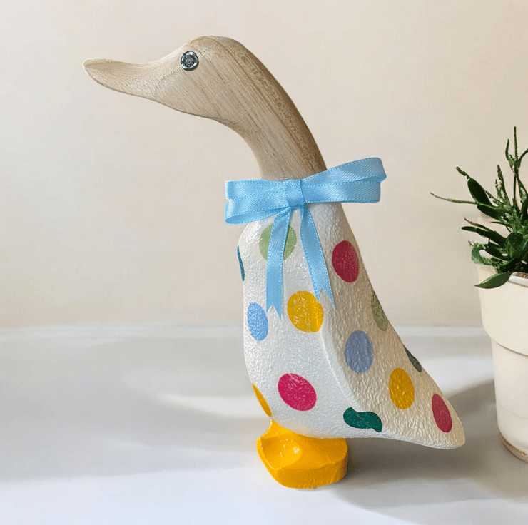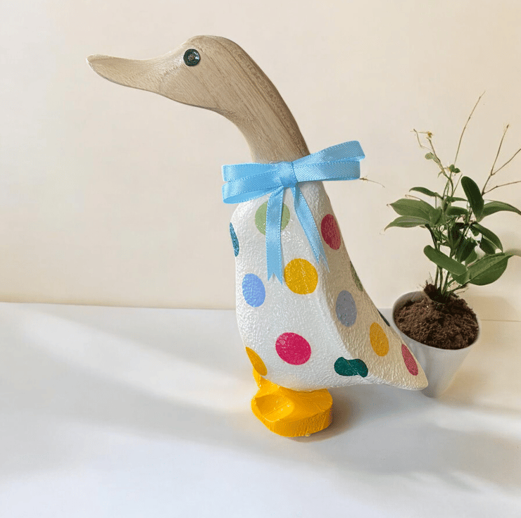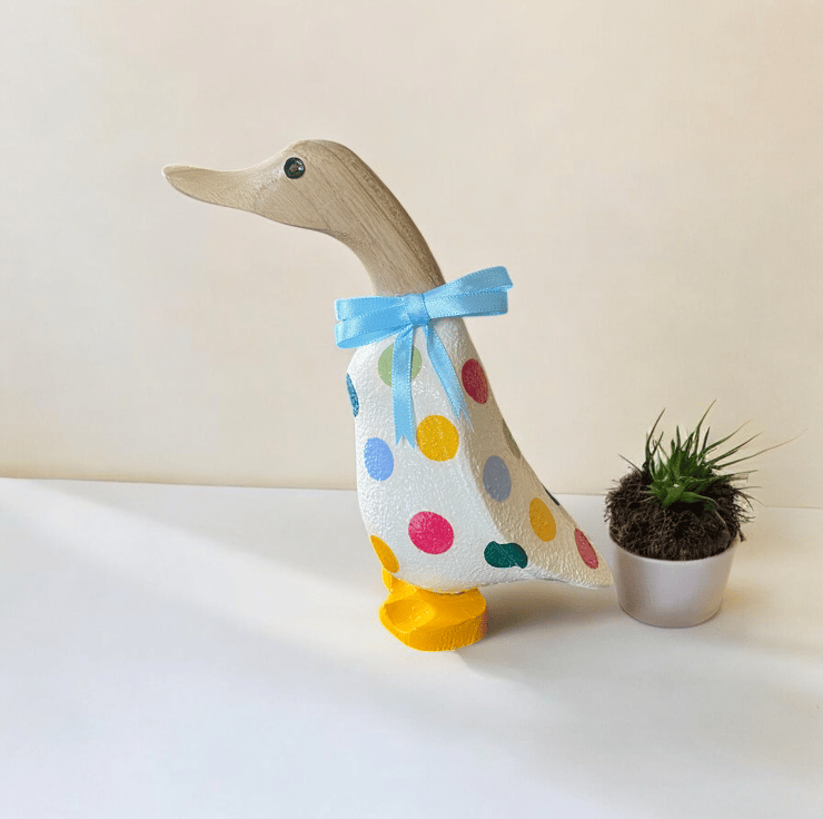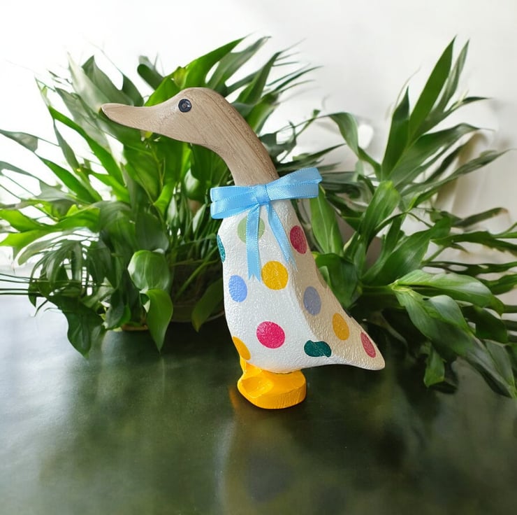 This bamboo duckling (approx 16 cm) has been hand painted and then decoupaged using an Emma Bridgewater paper napkin featuring Polka dots. The feet have been hand painted yellow. “Dottie” has been finished off with a lovely blue ribbon tied into a bow around her neck.