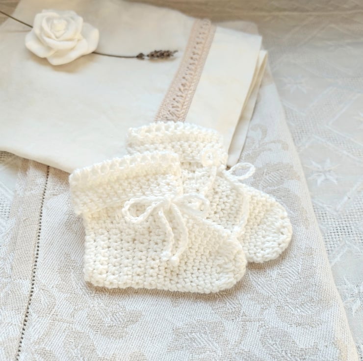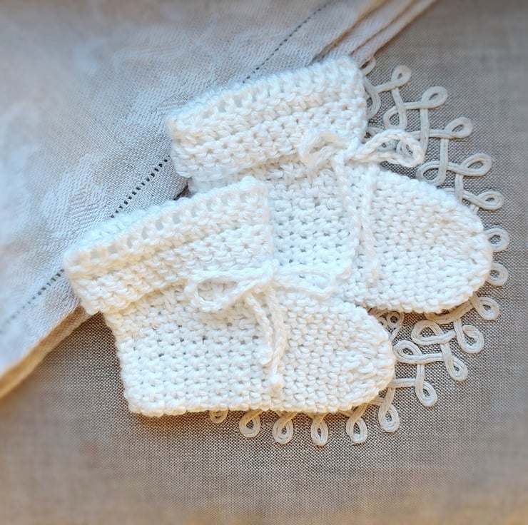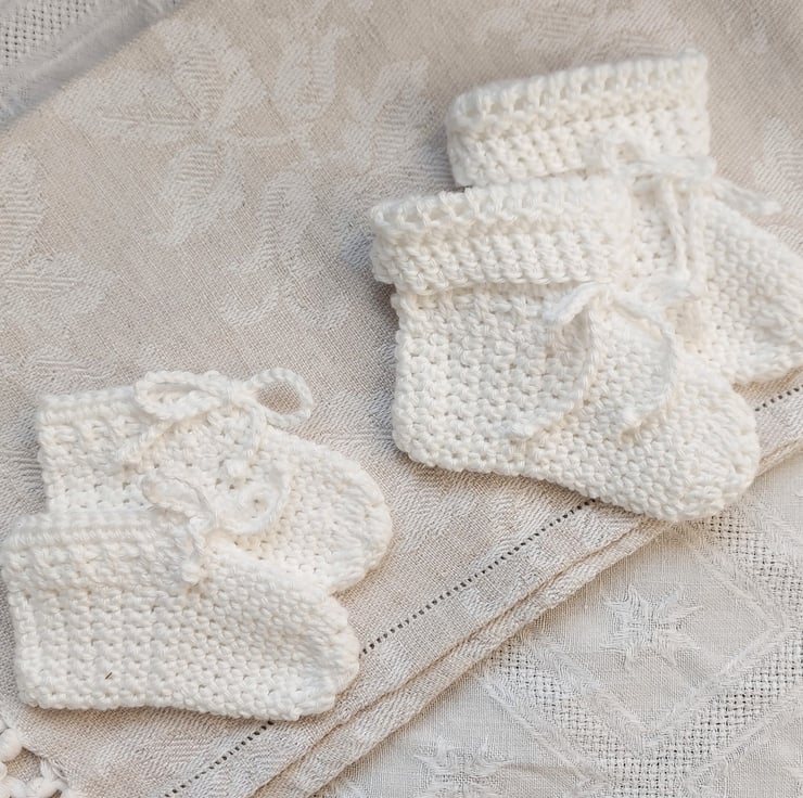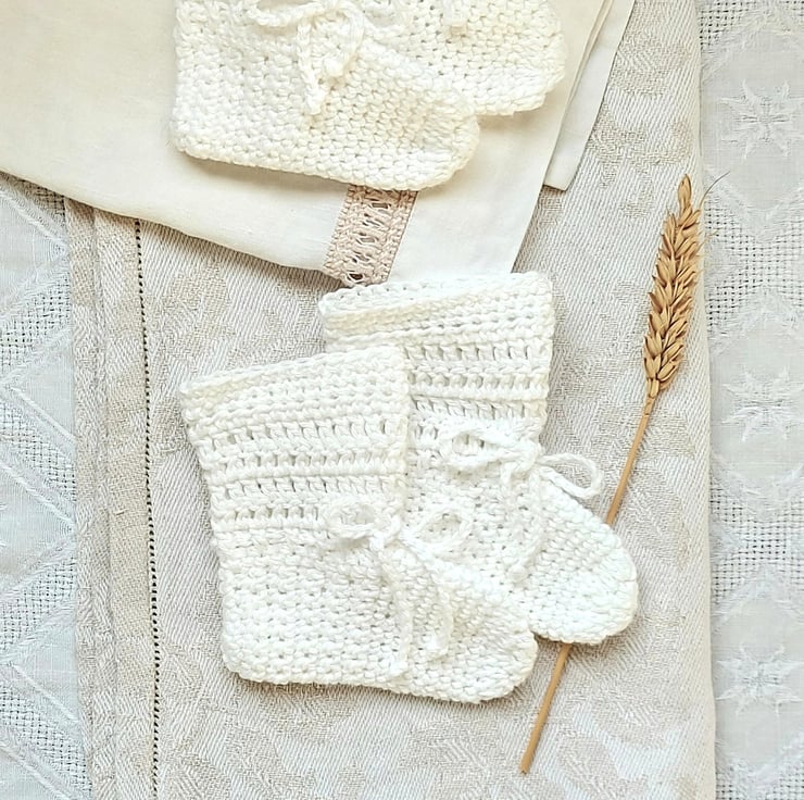 Booties need to be comfortable and not restrict your baby's feet. Please note that the measurements are only a guide, due to the different tension of the yarns and the individual crocheting of each unique handmade creation. The soft cotton stretches by 1 cm approx. Can fit from newborn up to 4-6 months, depending on individuals.