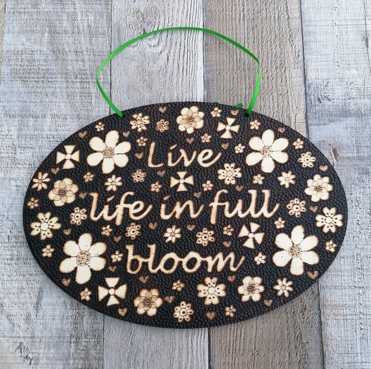 ‘Live Life in Full Bloom’ wooden pyrographed sign
