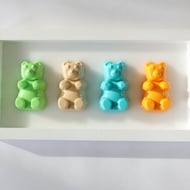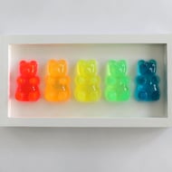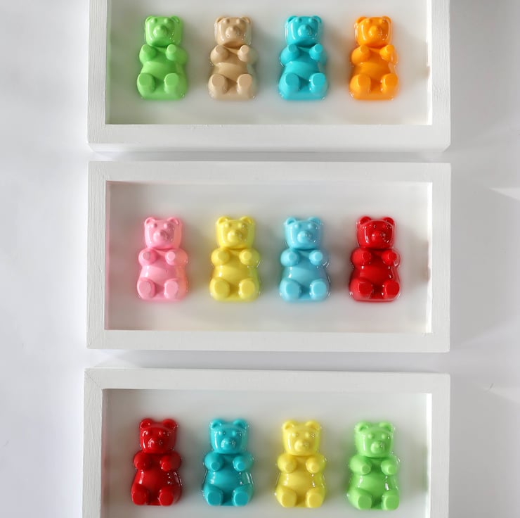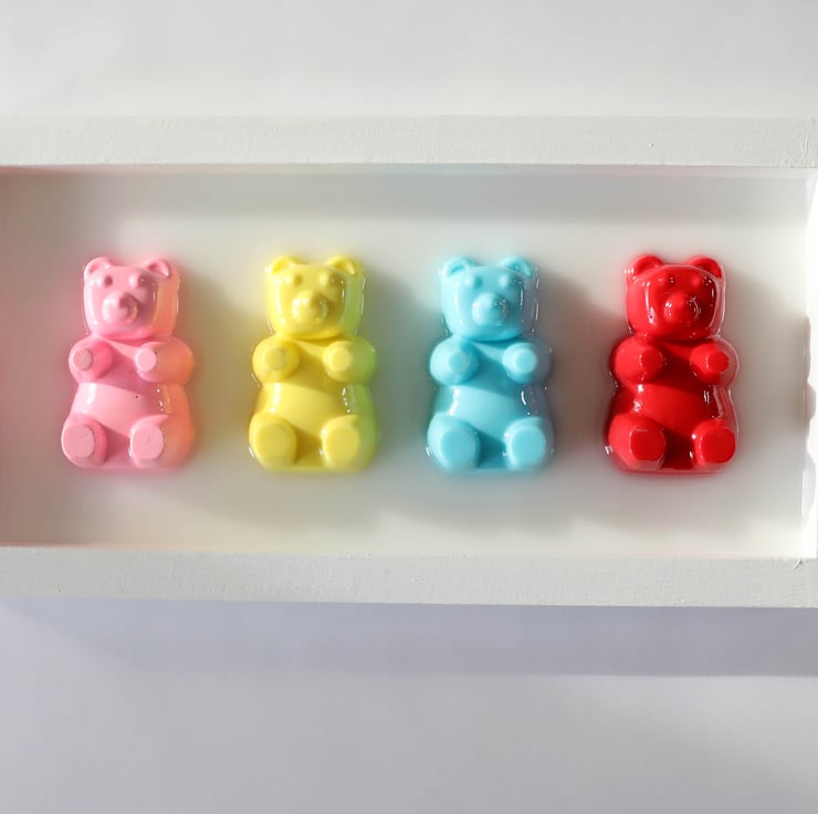 Introducing our Framed Gummy Bears, a whimsical addition perfect for brightening up any wall in your home. This delightful decor piece features four large, high-quality resin gummy bears in vibrant pop colours, all beautifully housed within a handcrafted white painted frame. Measuring 32.5cm wide and 16.5cm high, this charming artwork is designed to inspire joy and smiles for both kids and adults alike. Its unique aesthetic makes it ideal for children's rooms, playrooms, or even creative spaces where fun and color are essential.