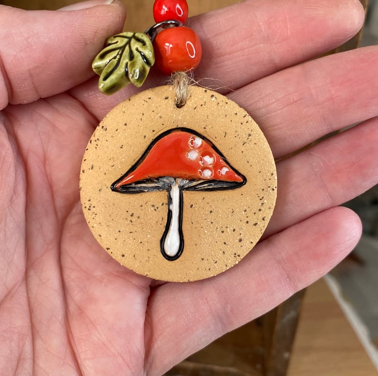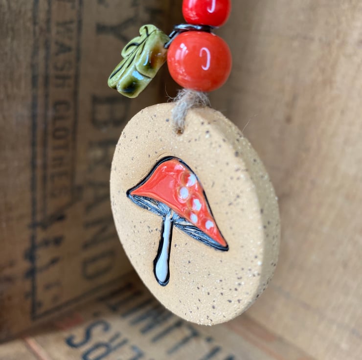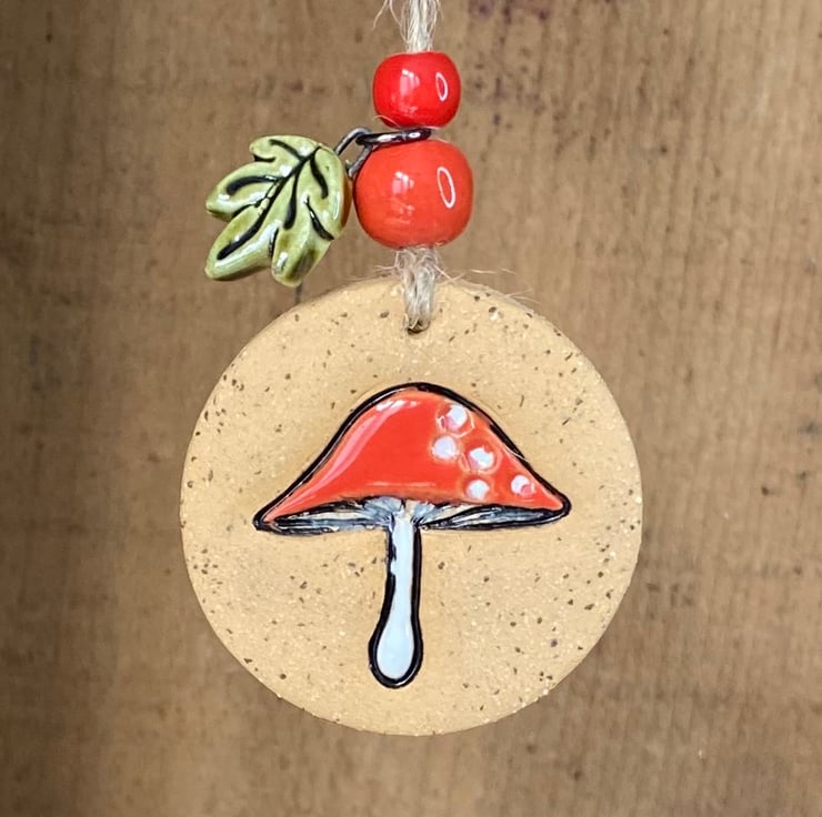 This ceramic toadstool decoration has been made from speckled stoneware clay and decorated with bright glazes. Two ceramic beads top it off with a little handmade leaf in between,. It has been fired twice and finished with a clear, glossy glaze. Glazed on the front only. It measures 4.5cm diameter x 0.5cm deep and hangs from a brown string.