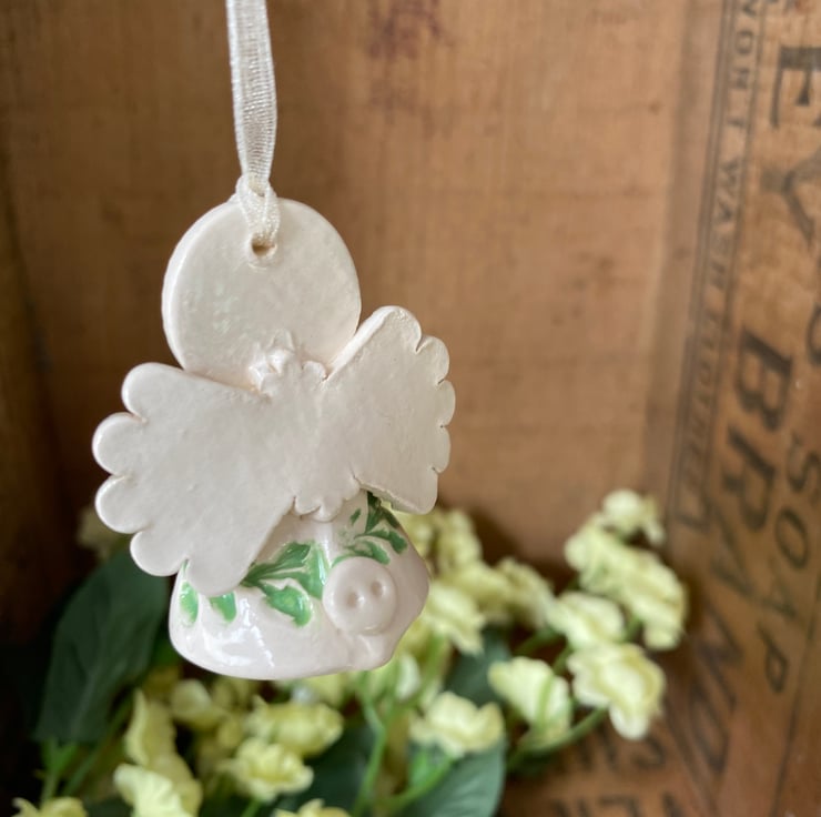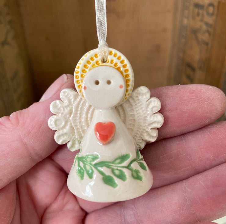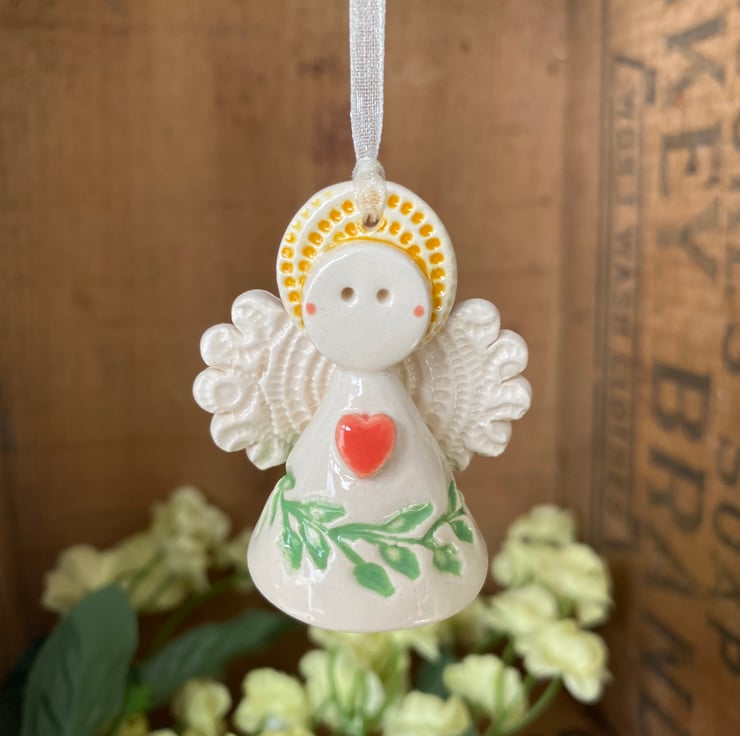 This tiny angel is made from white earthenware clay. She has a little cream dress and a cute little button detail at the back. She measures 5cm high x 4cm wide She's a little bit too wide to fit in a large letter parcel, (I blame all the biscuits!) so, she has to go as a small parcel but I hope you think she's worth the little bit of extra postage cost.