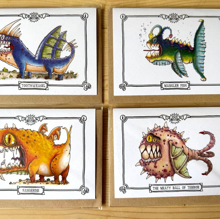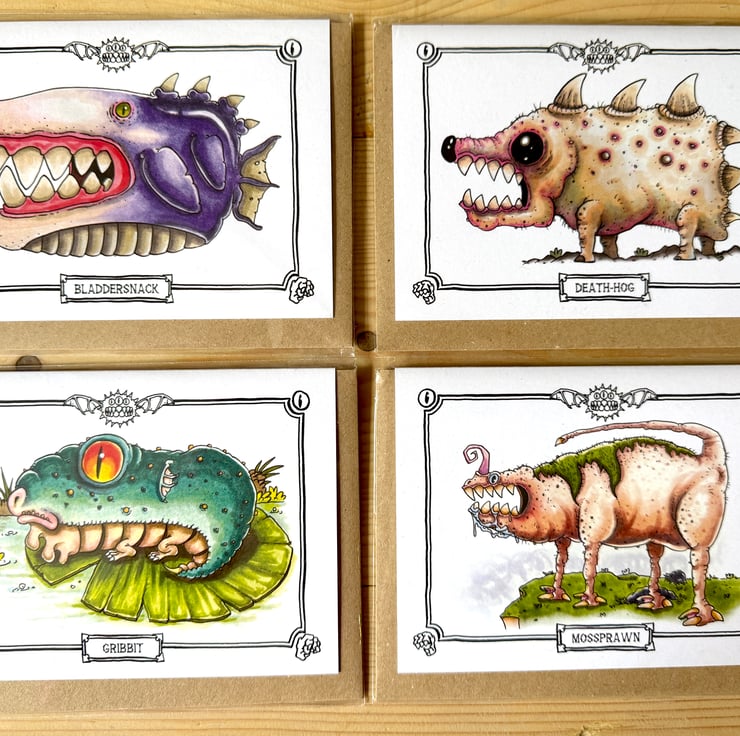 Pack contains 12 x A6 cards: Gribbit, Mossprawn, Death-hog, Bladdersnack, Mangler Fish, Toothweasel, Fangerine, The Meaty Ball of Terror, Grumblebee, Blah Blah, The Dread Baron and Father Crustmas.