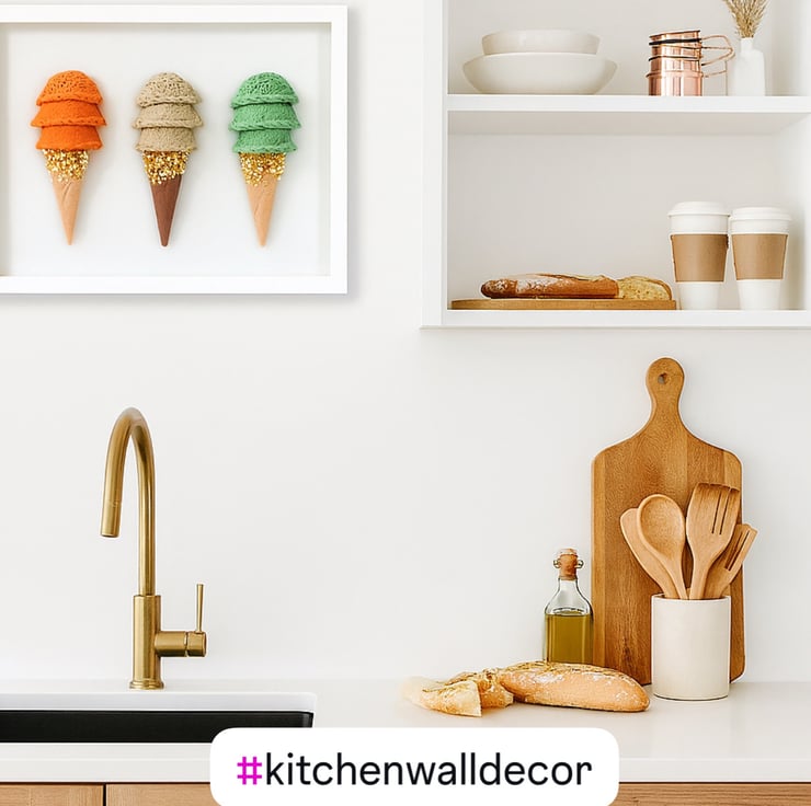 Indulge your love for whimsical decor with our stunning Ice Cream Resin Artwork! This vibrant collection features a delightful arrangement of triple scoop ice creams expertly handcrafted from high-quality epoxy resin. Each piece is meticulously created using specially designed molds, showcasing rich gourmet colors like burnt orange, cappuccino taupe, and mint tea green, adorned with handmade artificial sprinkled nuts. Perfect for bringing a sweet touch to your kitchen or dining room, this wall art is a unique statement piece that will captivate both family and guests.