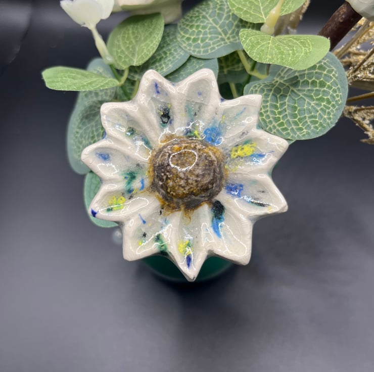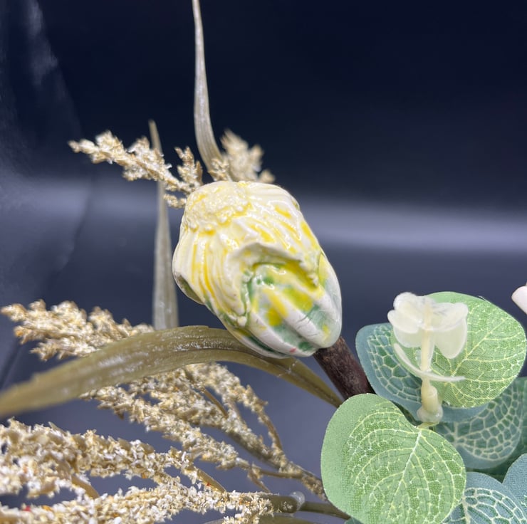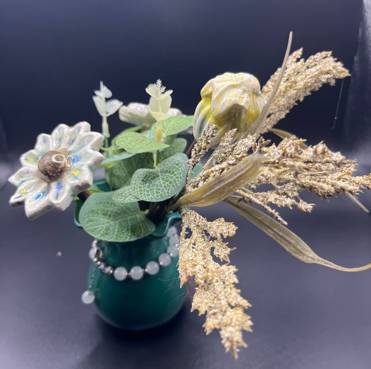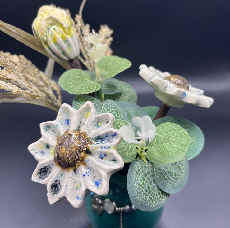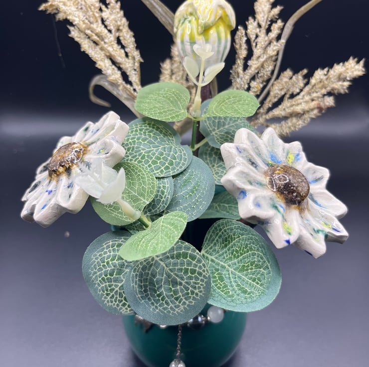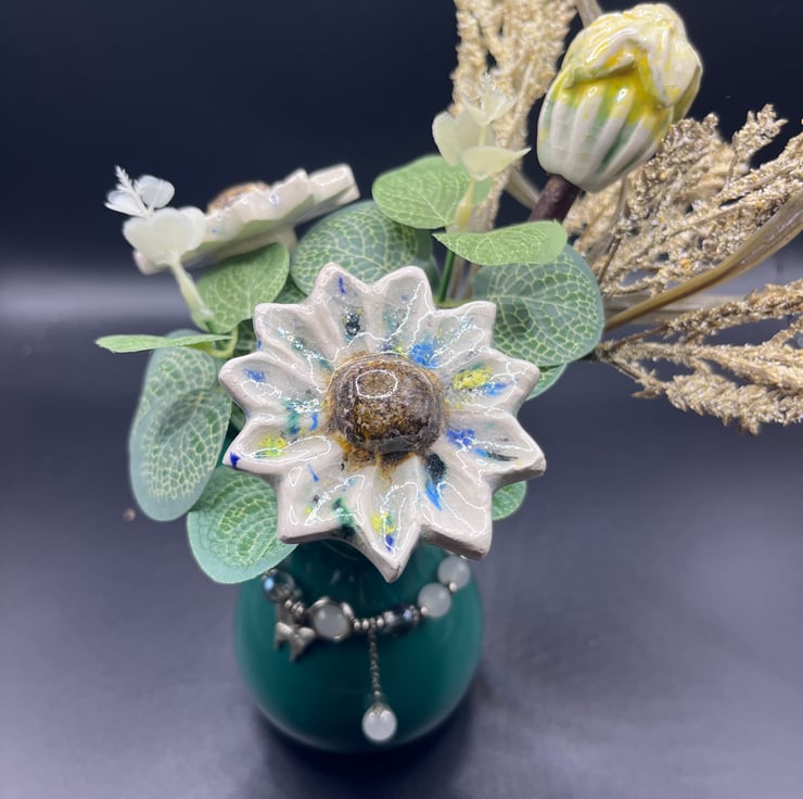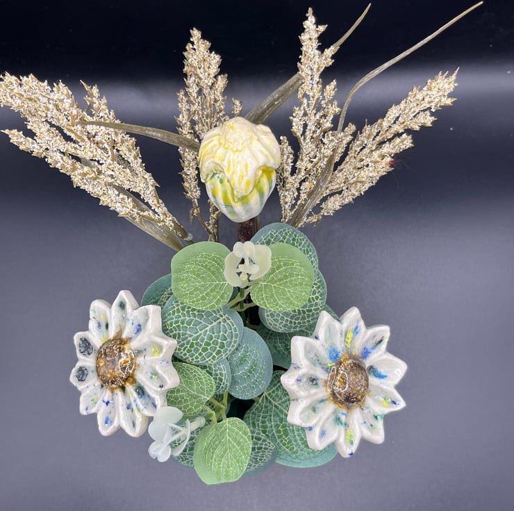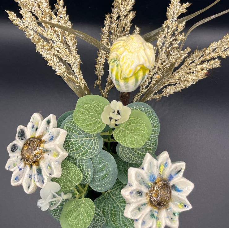 Vase of 2 flowers & a ceramic pod …blues yellow and brown glazes with faux foliage…vase is shop bought but looks good holding our flowers…arrangement is 200mm high approx and 160mm wide…both are approximately…
