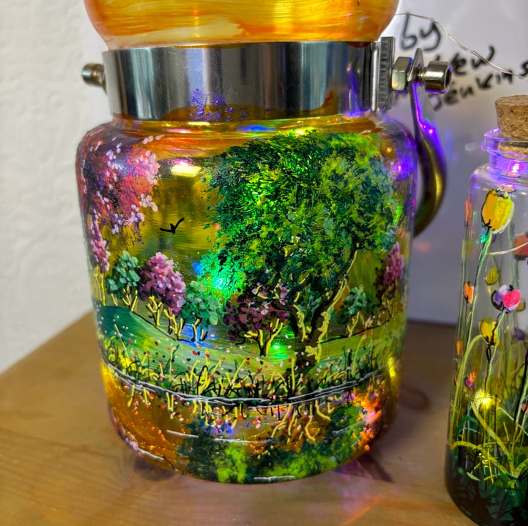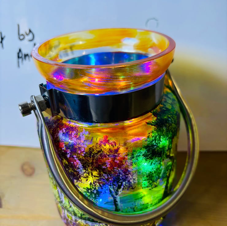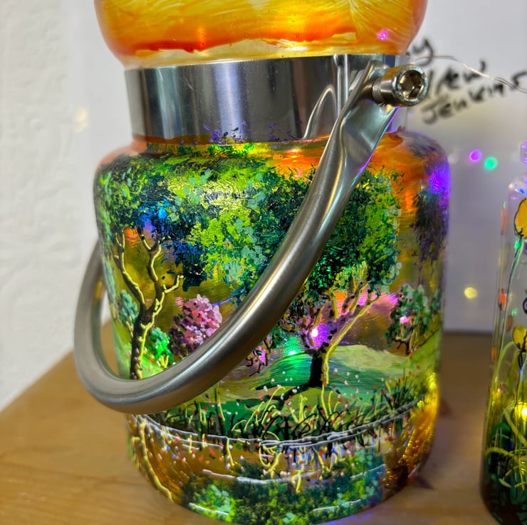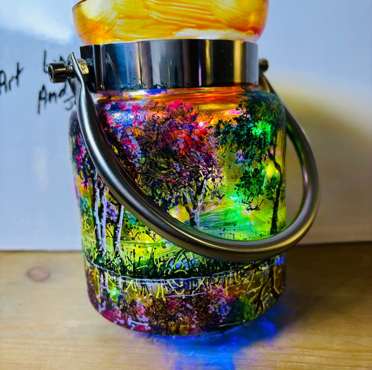 A hand painted and fired metal and glass lantern by Andrew Jenkins