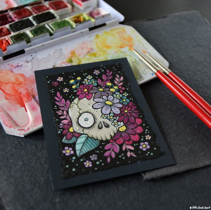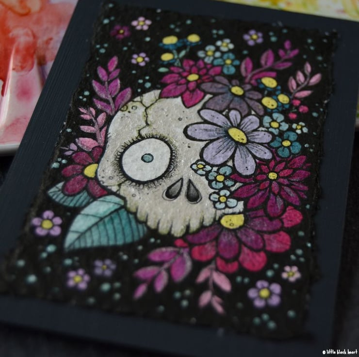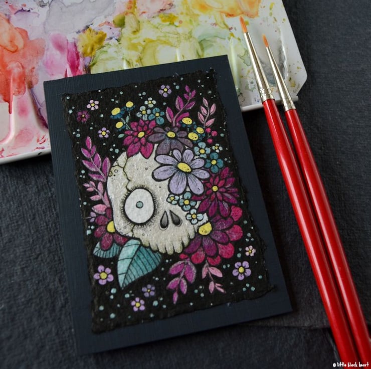this aceo is an original artwork, hand drawn with a tiny 0.05 nibbed pen, then coloured with ink, artists pens and watercolour paints, on indian khadi paper. khadi paper is handmade from recycled cotton rag, it has a lovely textured surface and deckled edges. i have then mounted the illustration onto 300gsm cardstock, hand painted with a paynes grey to create a dark surrounding edge/background.
