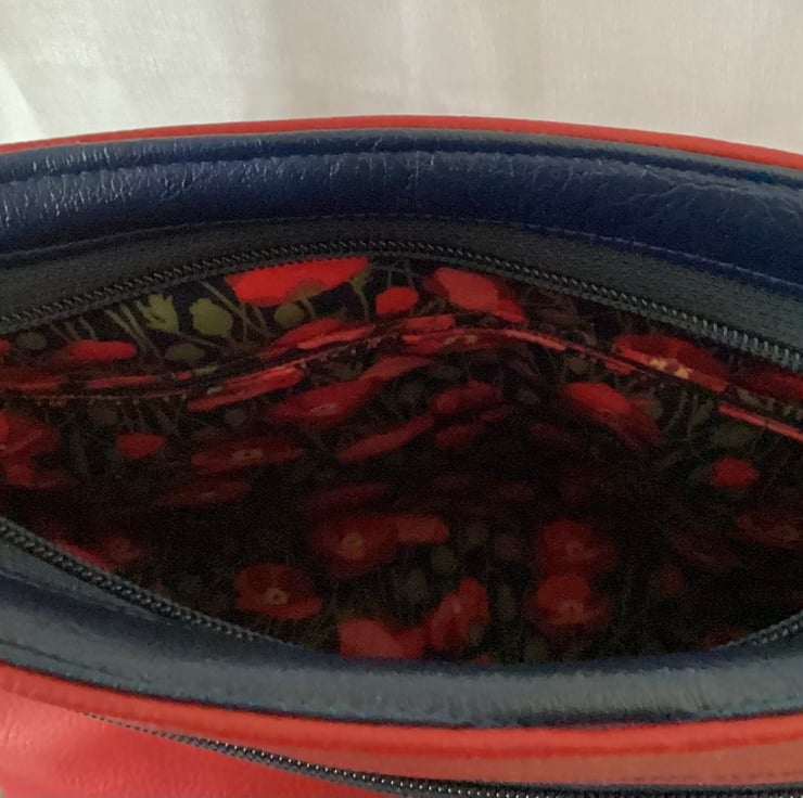 This crossbody bag is made from red vinyl with contrasting blue vinyl base. It features a top zip closure, an exterior zip pocket and lining zip pocket. The lining is cotton in a pretty red poppies print.