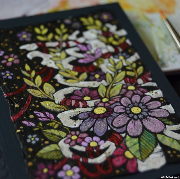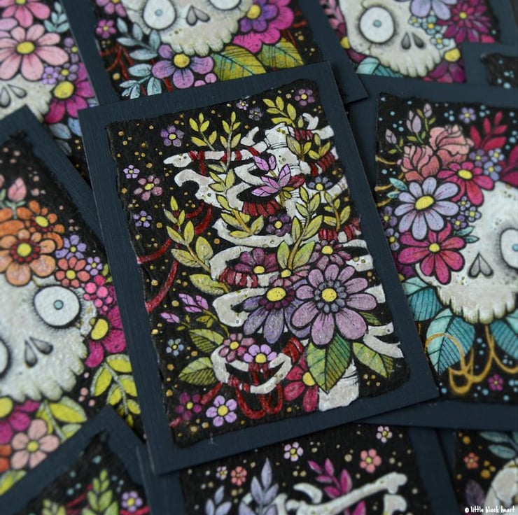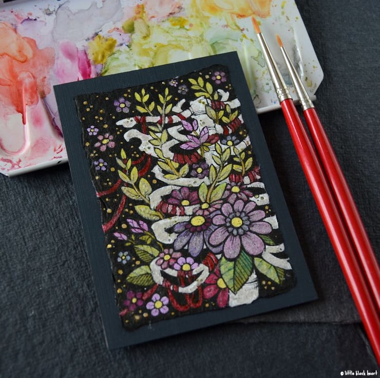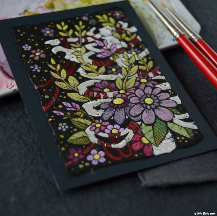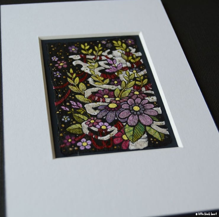 this aceo is an original artwork, hand drawn with a tiny 0.05 nibbed pen, then coloured with ink, artists pens and watercolour paints, on indian khadi paper. khadi paper is handmade from recycled cotton rag, it has a lovely textured surface and deckled edges. i have then mounted the illustration onto 300gsm cardstock, hand painted with a paynes grey to create a dark surrounding edge/background.
