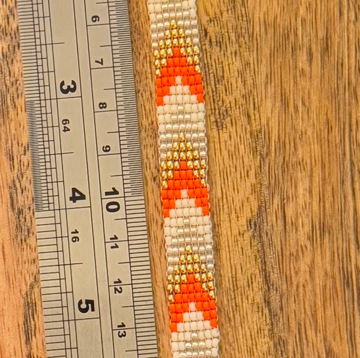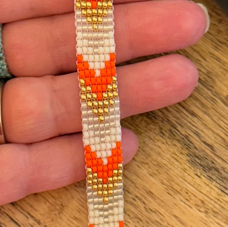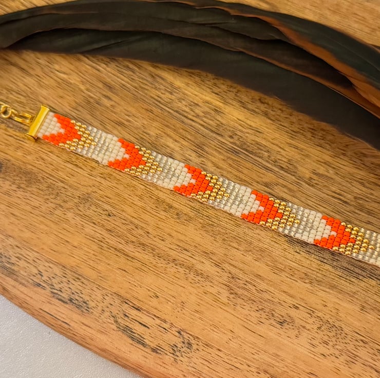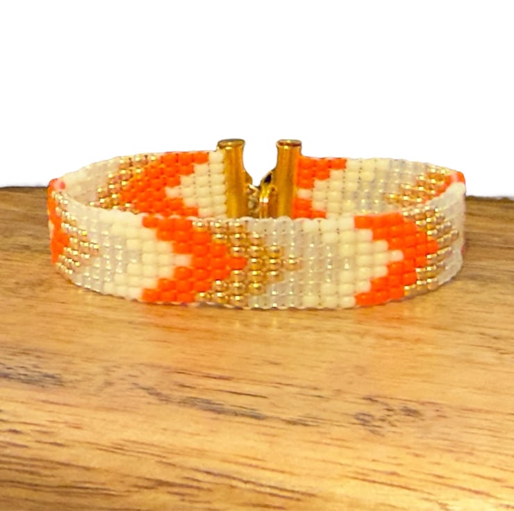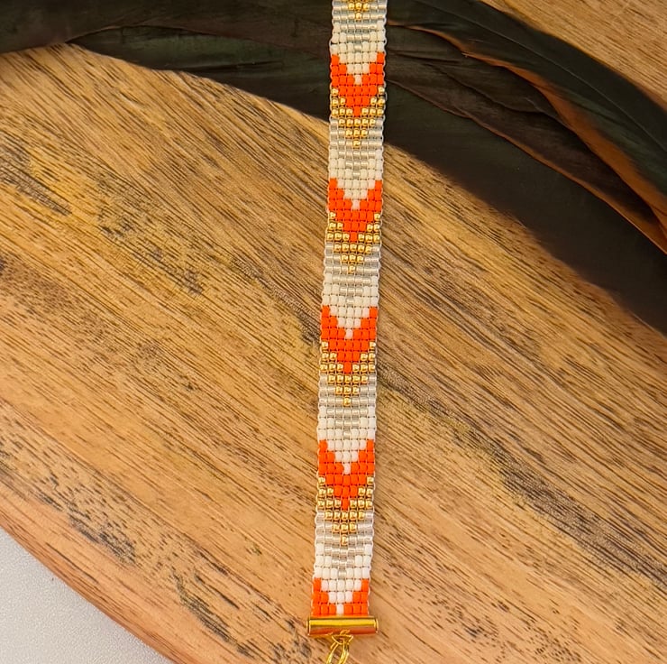 This colour handmade bracelet has be made the Japanese Miyuki seed beads. The small seed beads have been hand woven together in a square stitch in a mix of orange, gold and cream tones. This bracelet is inspired by my love of Native American jewellery and the bead design is a slim chevron pattern.