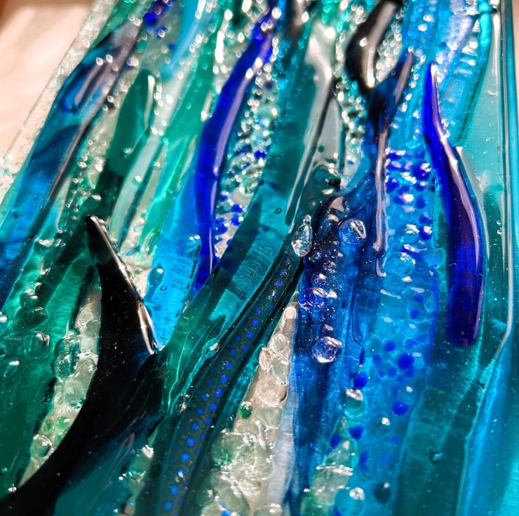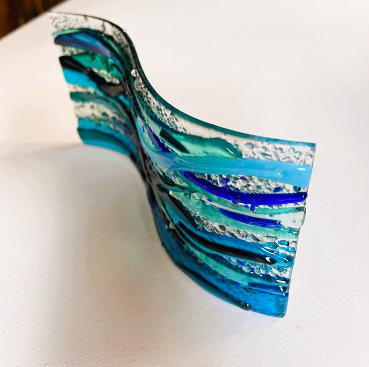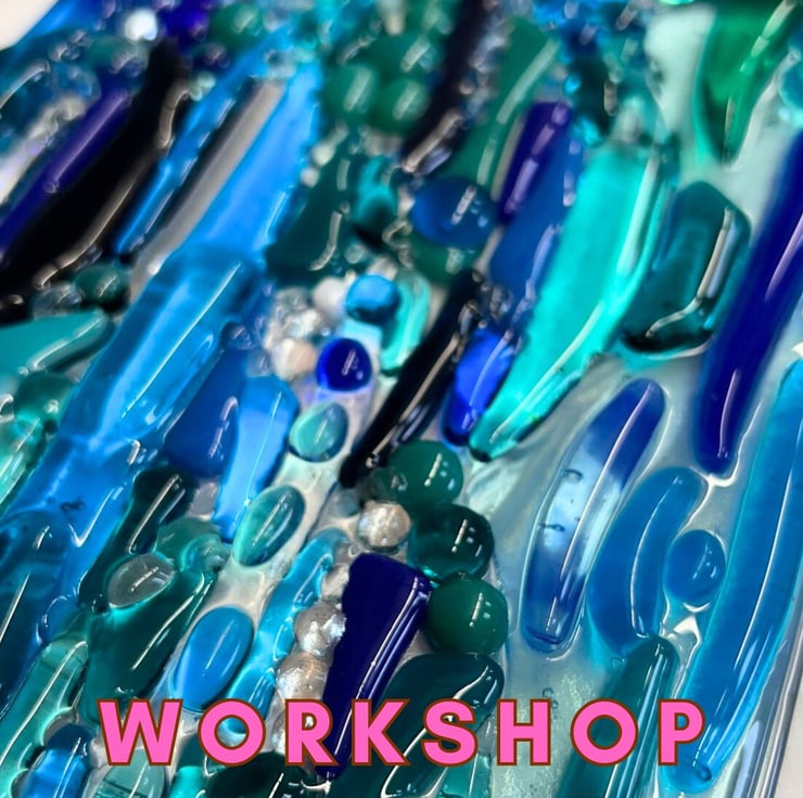 In this workshop you will create a stunning fused glass wave using lots of different colours and shades of blue glass to create a water effect. You will learn how to build up your artwork by using small pieces, glass paint and frits (crushed glass). This workshop will require you to cut glass, but please don't let this put you off, I will teach you how to do that and it's super fun!