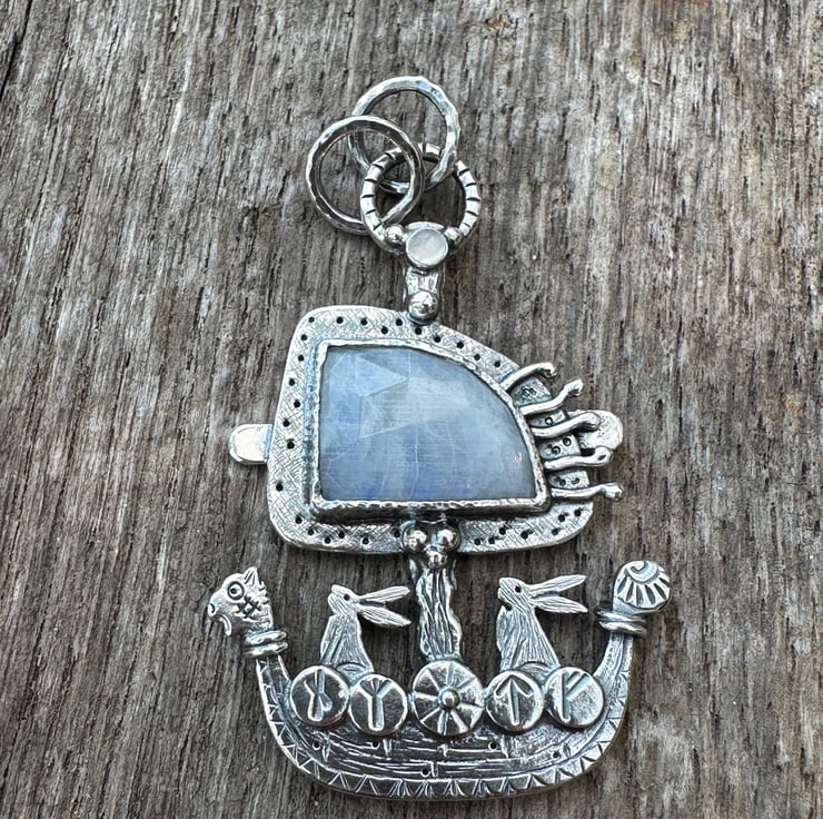 This ship is set with a beautiful rose cut moonstone cabochon which has a lovely flash. I have also set a 3mm white moonstone cabochon above the sail.