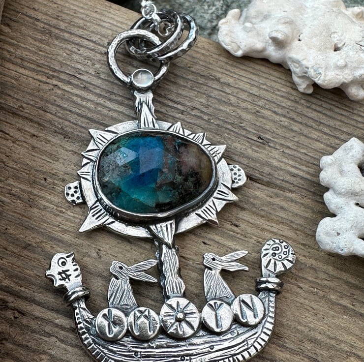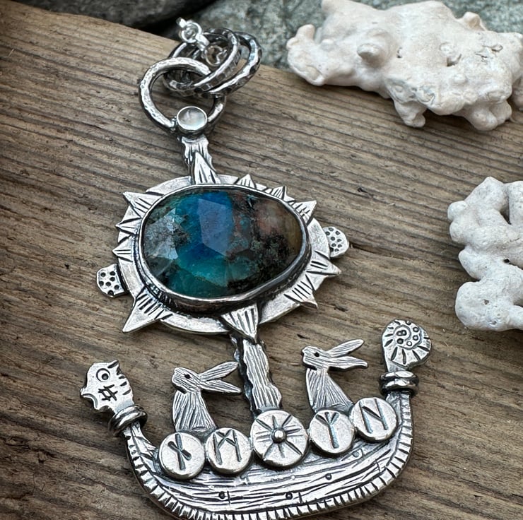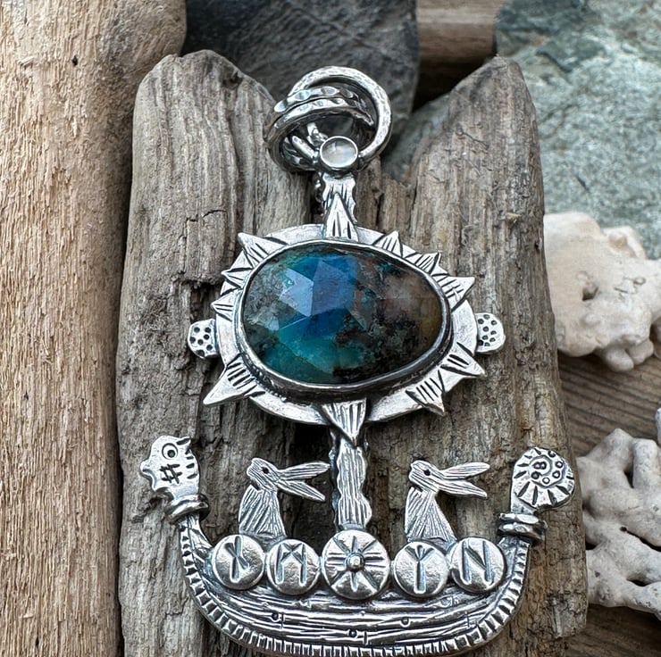 This ship is set with a beautiful rose cut Chrysocolla cabochon. I have also set a 3mm white moonstone cabochon above the sail.