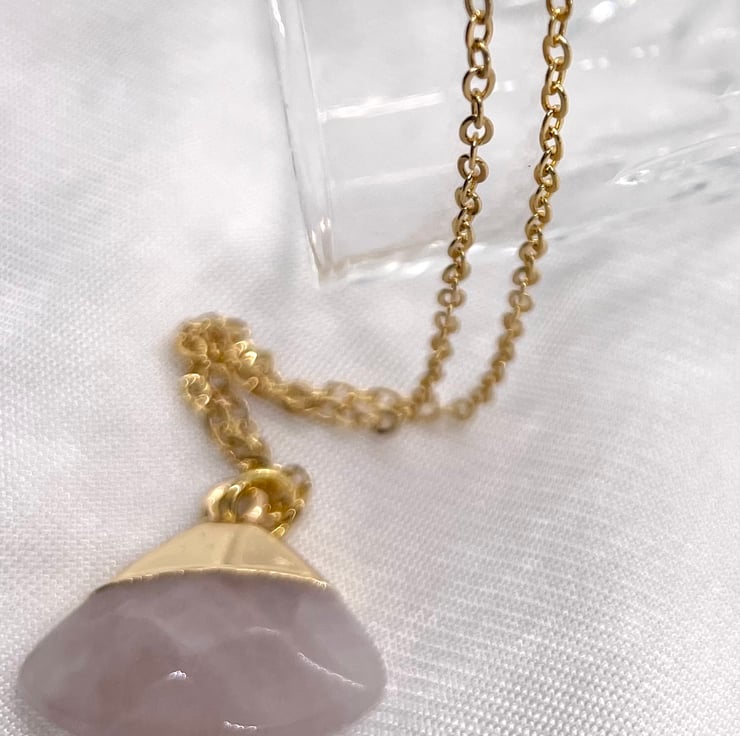 Romantic rose quartz semi-precious delta shaped pendant necklace on a gold vermeil chain. Approximately 18 inches in length. Would make a lovely Mother’s day present.