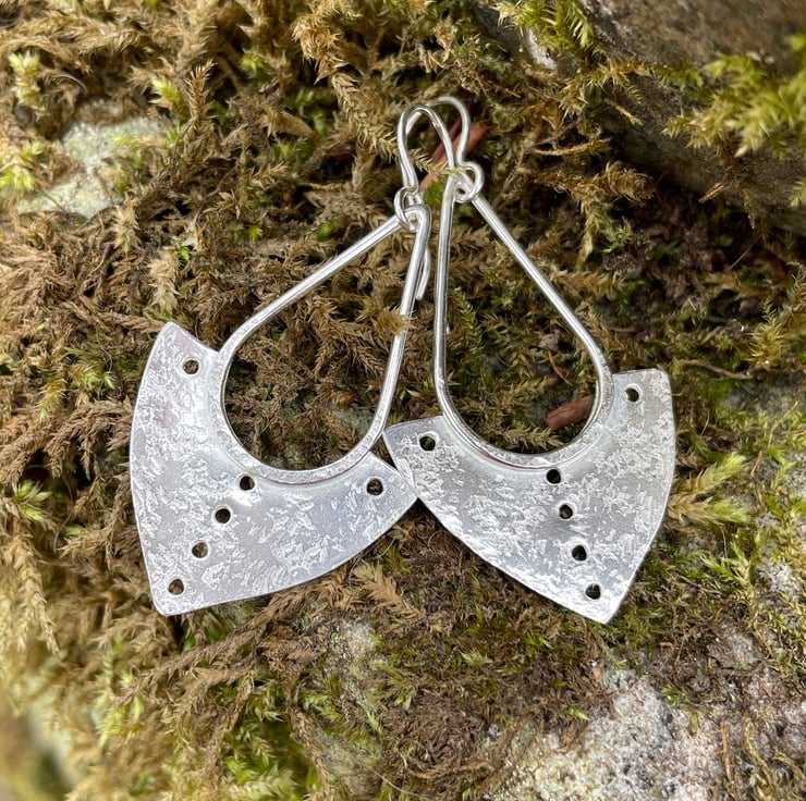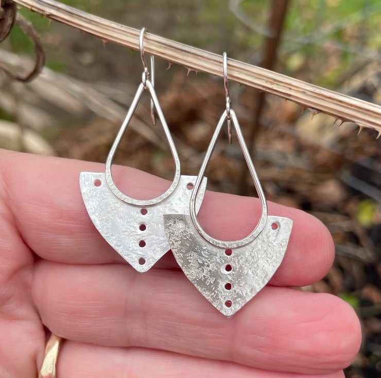 Shield shapes sit below tear drop loops, and hang from hook ear-wires. The earrings have 4 central and 2 shoulder cutouts adding depth and detail.