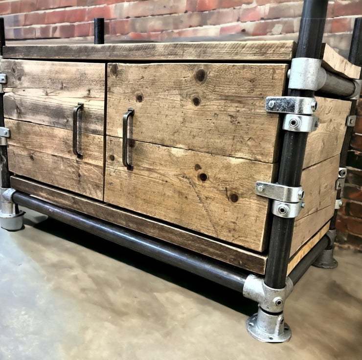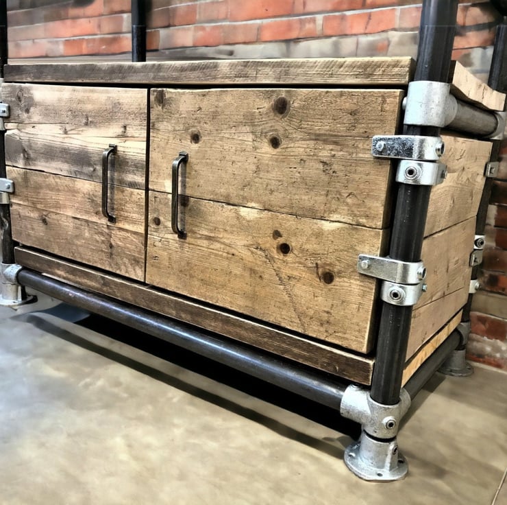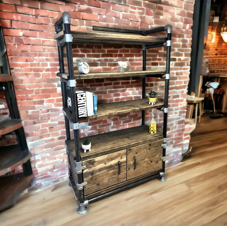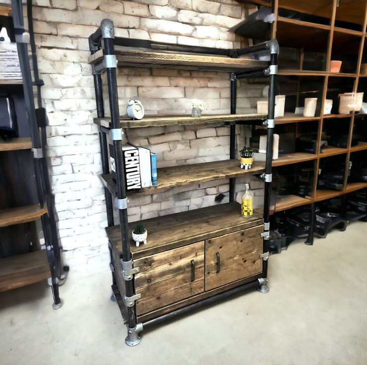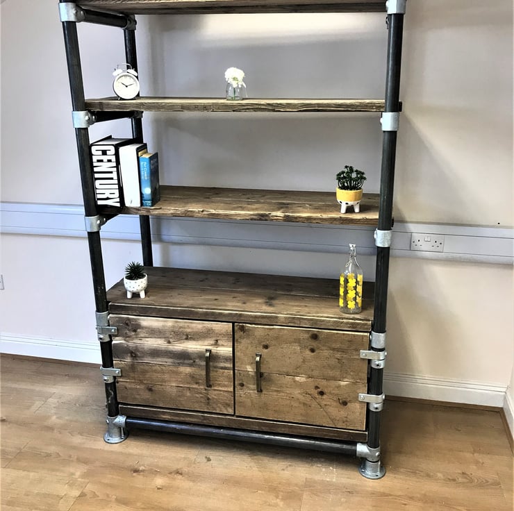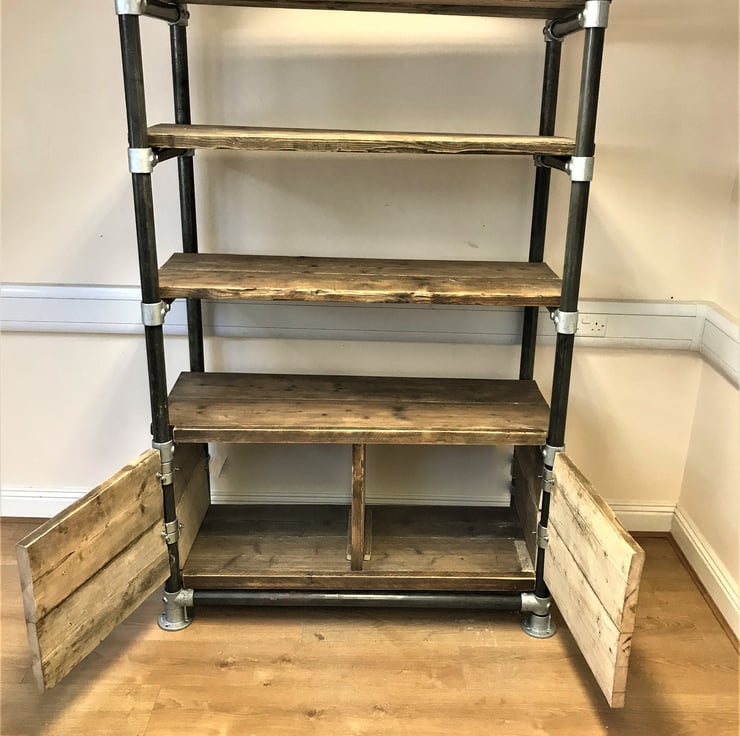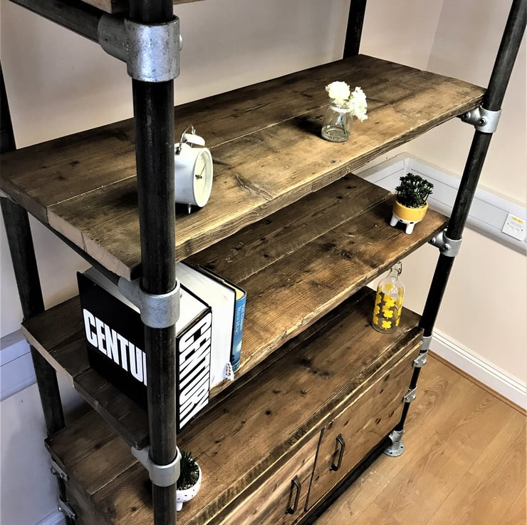 Using reclaimed scaffolding boards this shelving unit with cupboard drawer provides an industrial feel to any household or office space. They can also be used for office storage or any other storage needs.