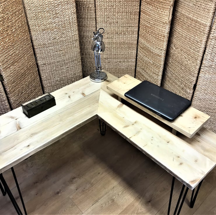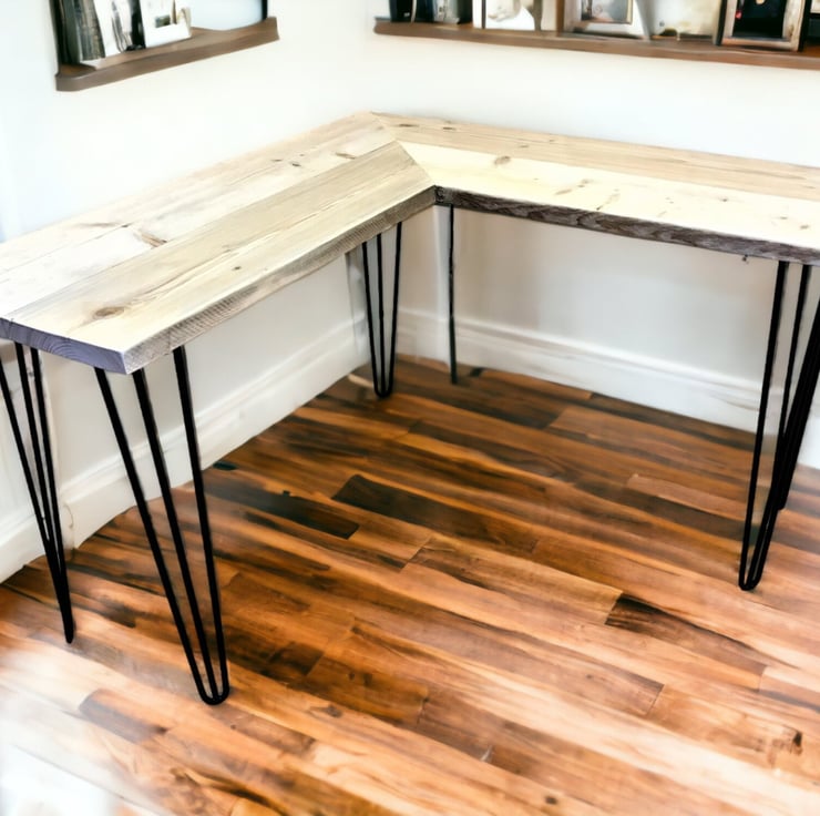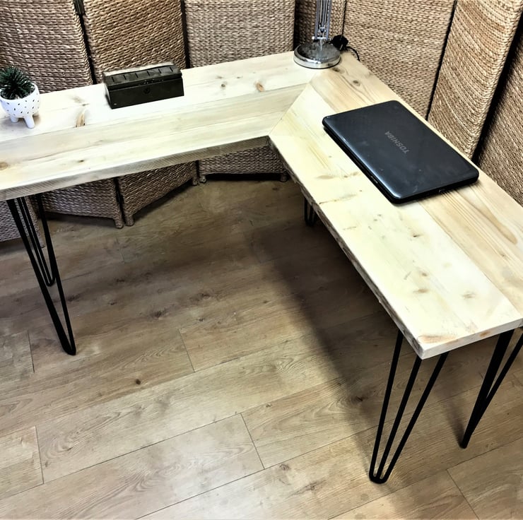 This corner desk (office desk) is a sleek and striking statement piece that will make the very best impression in your reception space or home office. Made from reclaimed scaffold boards with steel hairpin legs.