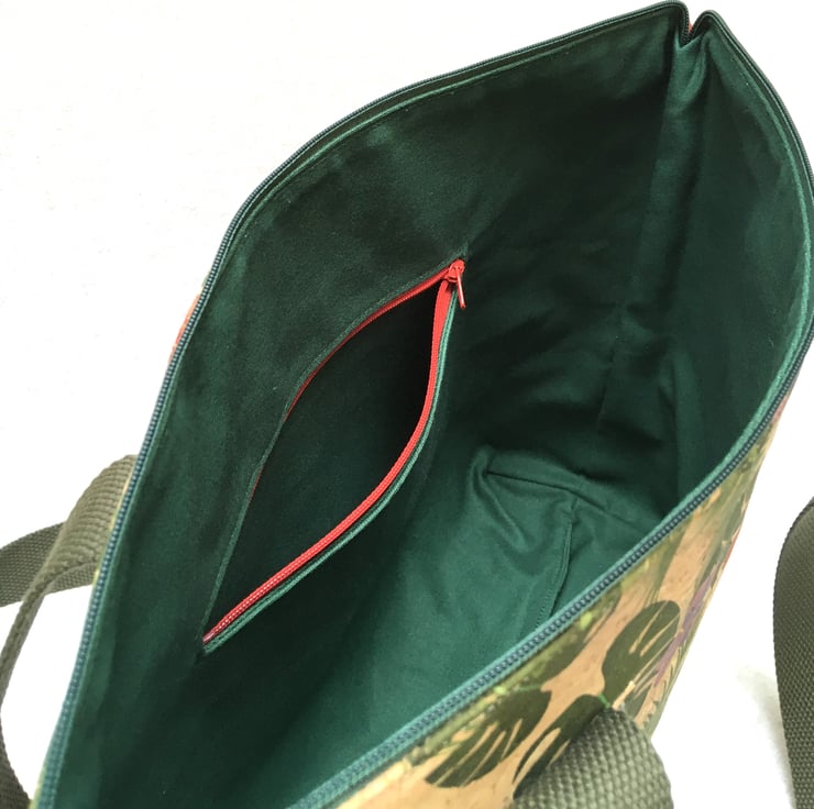 This cork shoulder bag has a bright design of Monstera leaves and flowers in pink and red. Inside it is fully lined in a bottle green cotton and has a zipped pocket.