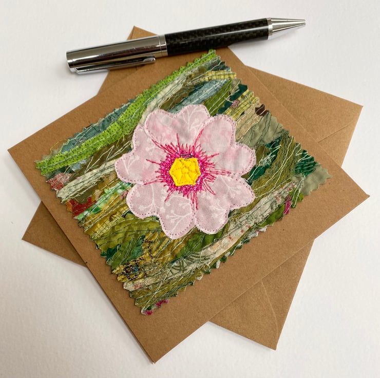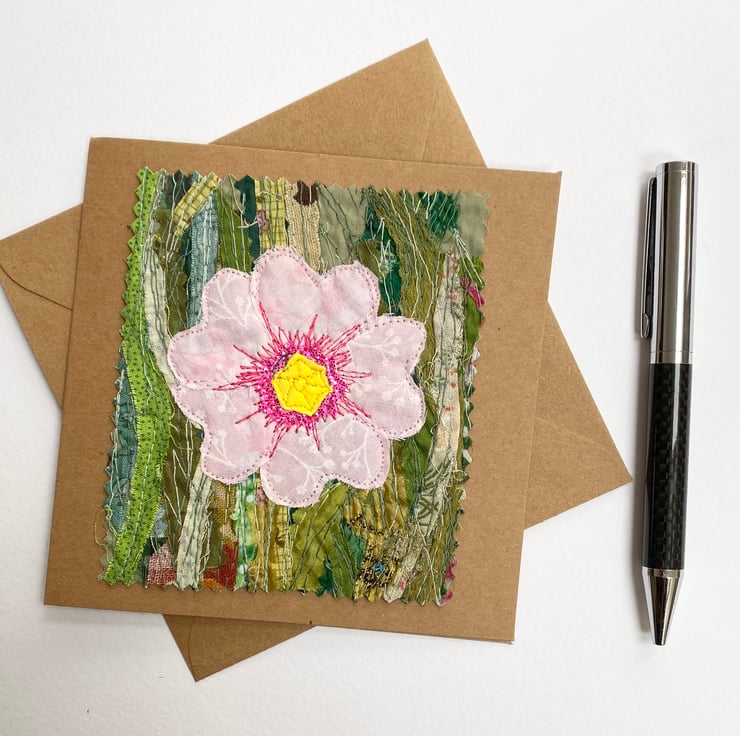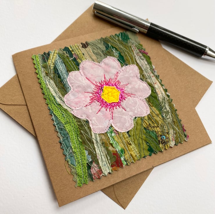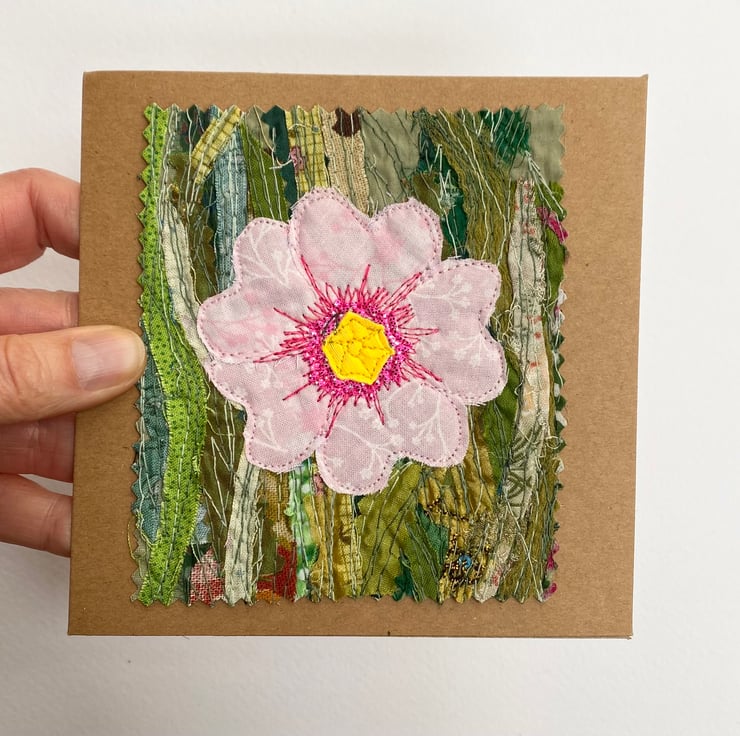 This sweet embroidered primrose flower garden card has been made with up-cycled fabrics and enhanced with free motion embroidery. It’s perfect for special people and occasions. It is blank inside. This brown card measures 13.5 x 13.5cm, comes with an envelop and in a plastic cover for protection.