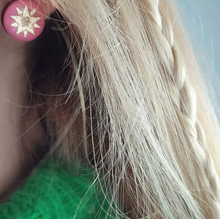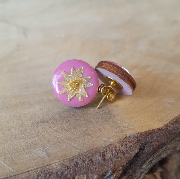 'Steren' - Cornish for Star. These pink, celestial wooden stud earrings are designed and hand-painted/made by me. The shimmering gold stars have a gold crust centre and are coated with a thin layer of resin, giving them an extra shiny finish. The back of each earring has been painted and coated with a matte varnish to protect the paint and wood.
