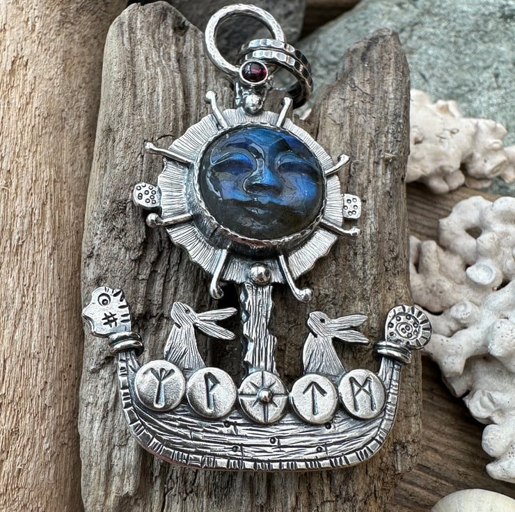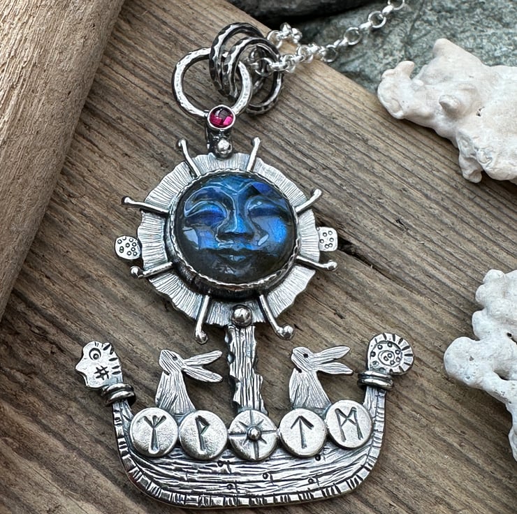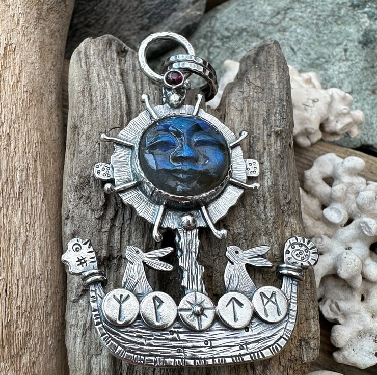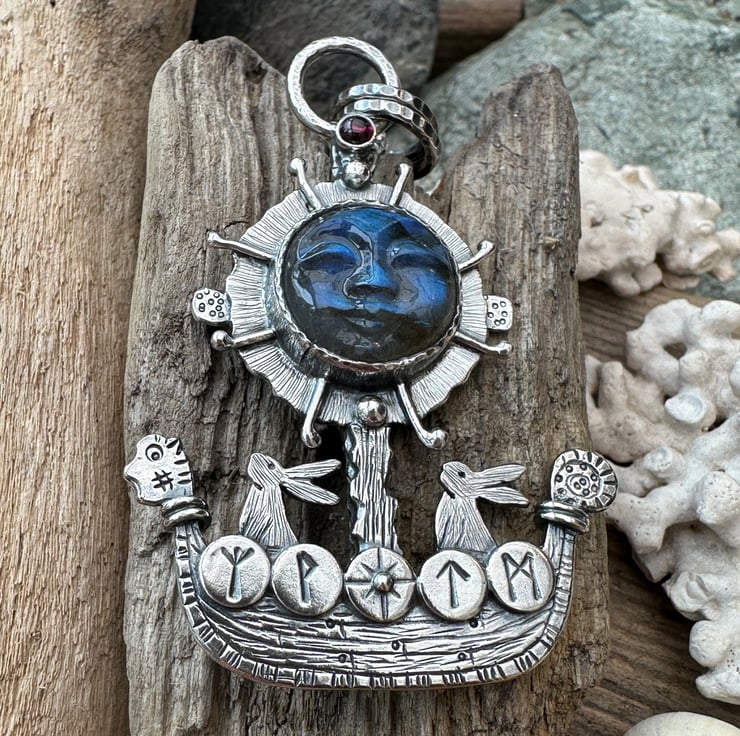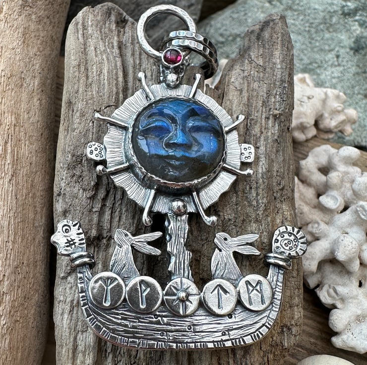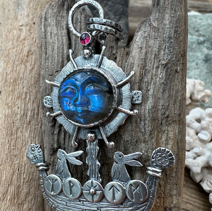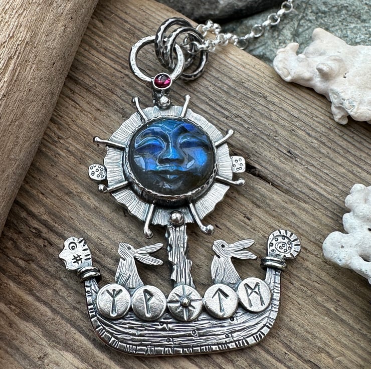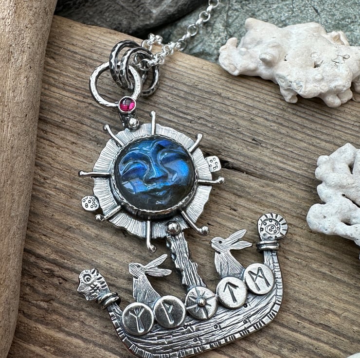 This ship is set with a beautiful labradorite carved cabochon face (a stone which I have carefully sourced as I feel they are quite magical set in the sail). I have also set a 3mm white moonstone cabochon above the sail.